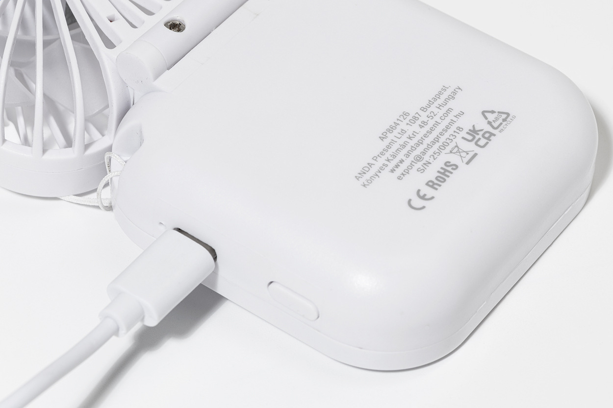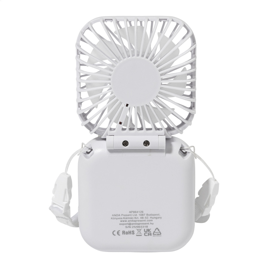 Elektrický ručný vetráčik z recyklovaného ABS plastu s pútkom na krk a vstavanou dobíjacou batériou cez USB (500 mAh). S nastaviteľným uhlom hlavy a 3 rýchlosťami. Vrátane USB kábla na nabíjanie.