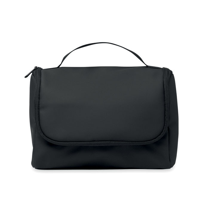 Kosmetická taška z měkkého PU s háčkem na zavěšení a podšívkou z materiálu 210D RPET. Jedna velká hlavní přihrádka s vnitřní přihrádkou ze síťoviny na zip a 1 přihrádka ze síťoviny.