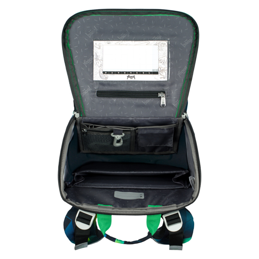 • Vo vnútri aktovky je priehľadná kapsička na rozvrh a vnútorný organizér umožňujúci rovnomerné rozloženie hmotnosti, doplnený gumičkou na fixáciu.