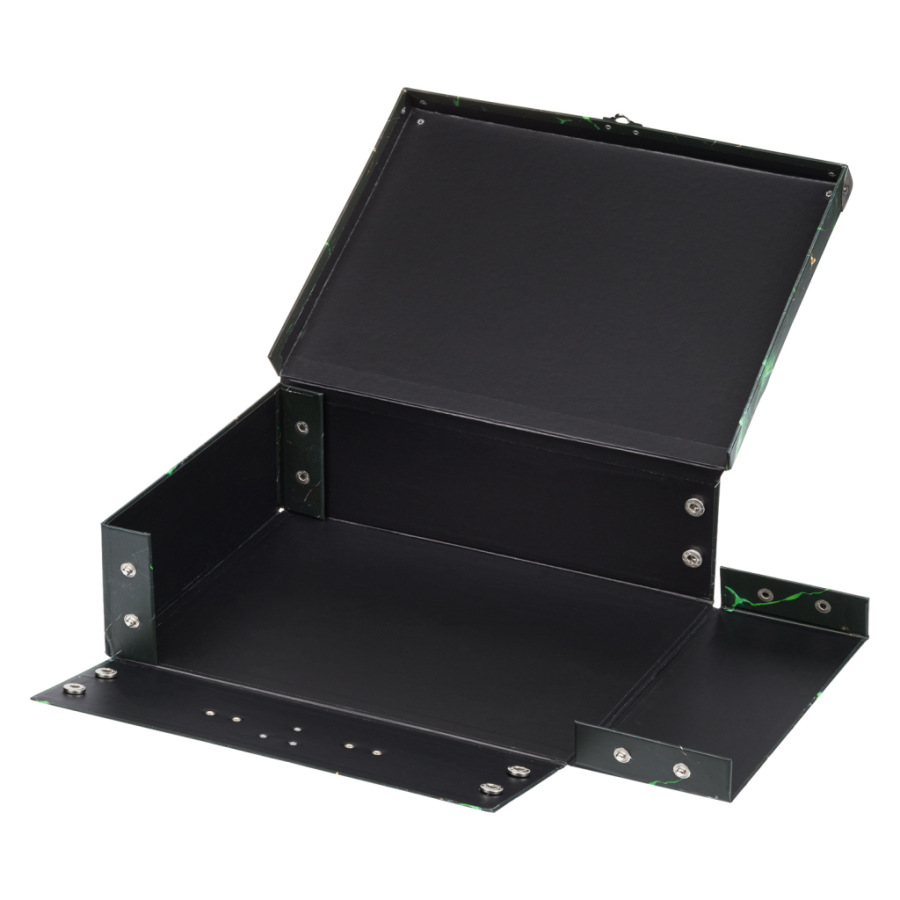 • Vďaka dômyselnému zacvakávaciemu systému možno kufrík so okovanými rohmi ľahko zložiť a rozložiť v priebehu niekoľkých sekúnd.