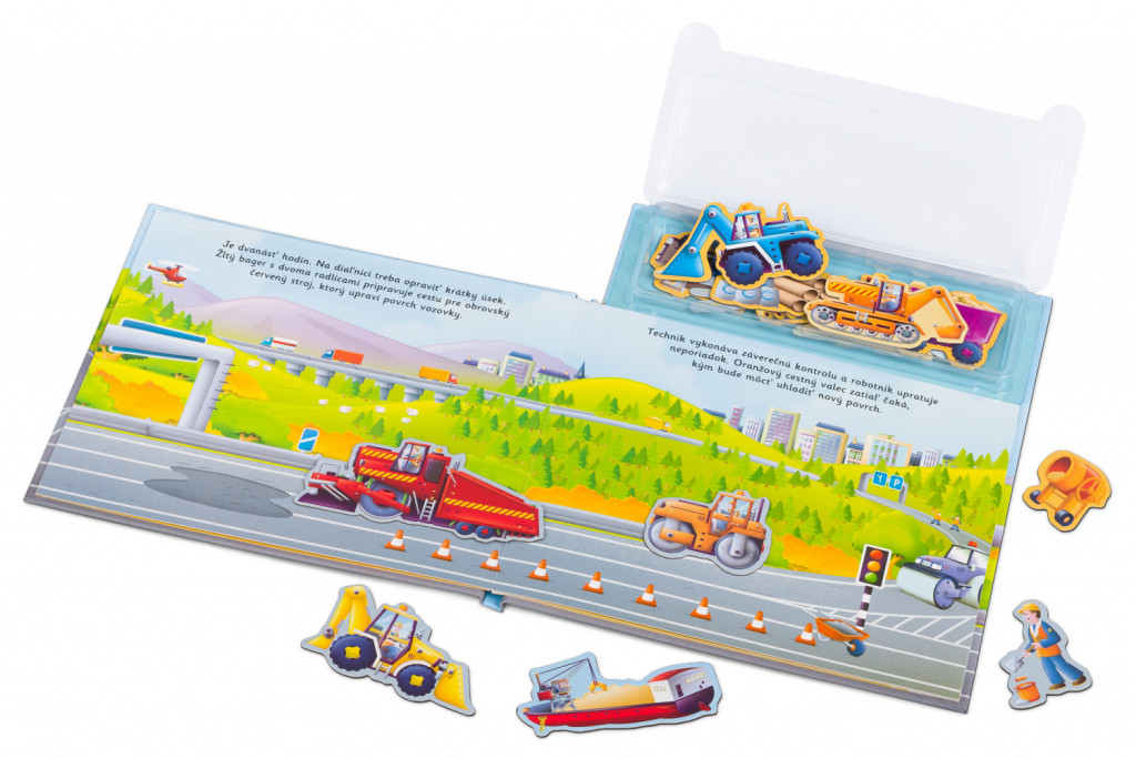 Na každej stránke tejto knižky objavia deti kratučký príbeh, ktorý môžu spoluvytvárať pomocou magnetiek. A keď sa do sýtosti vyhrajú, môžu všetky stroje „zaparkovať“ späť do úložného boxu, kde budú pripravené na ďalšiu zábavu.