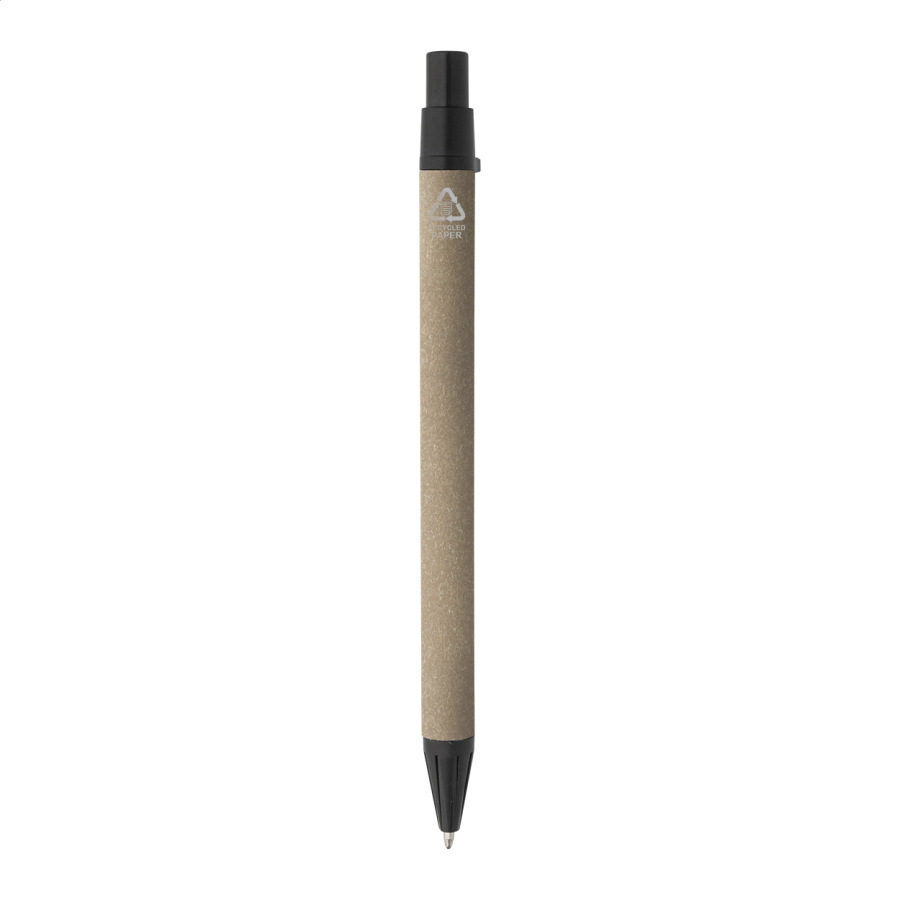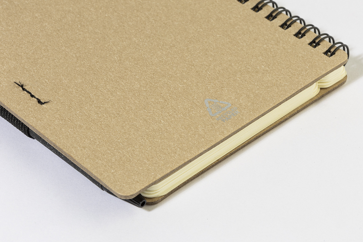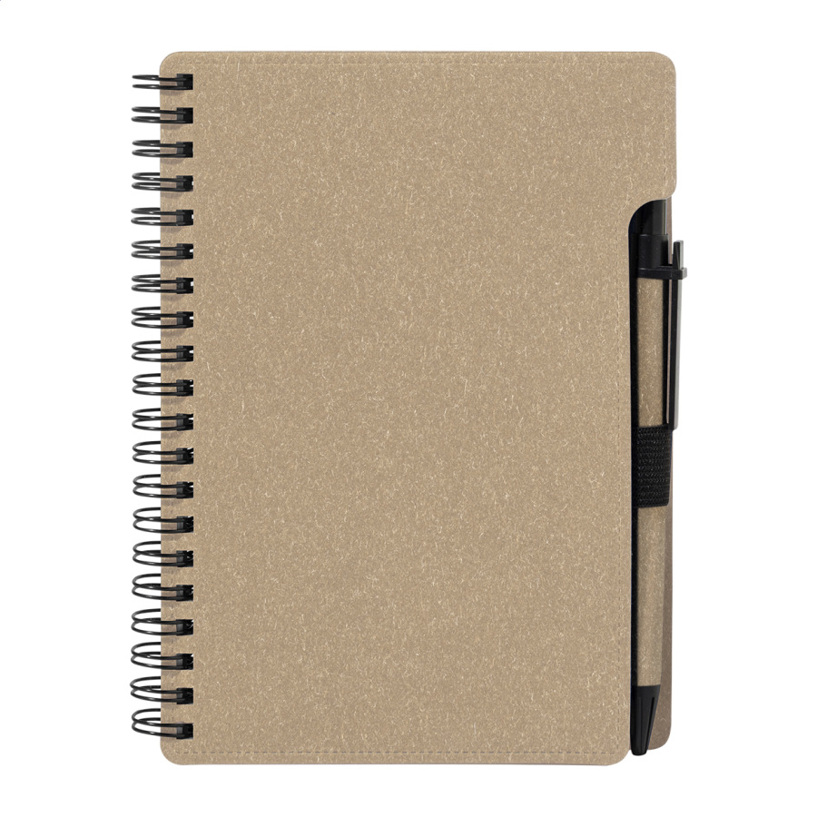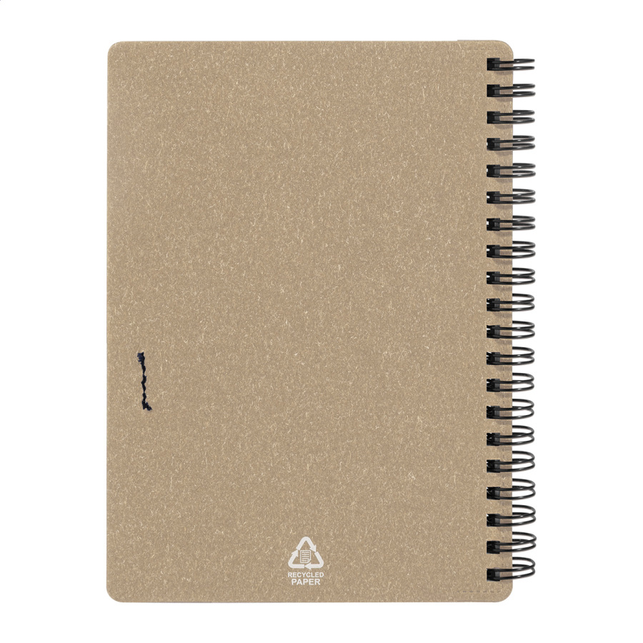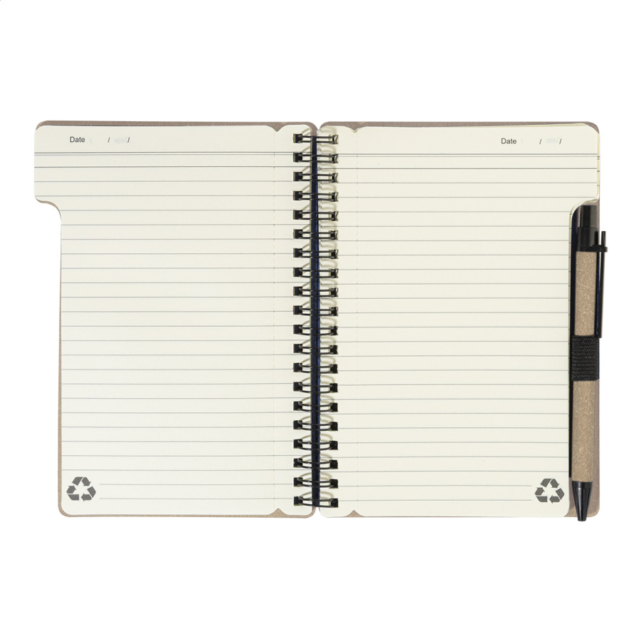 Špirálový blok A6 z recyklovaného papiera s 80 linajkovými listami. Vrátane recyklovaného papiera a guľôčkového pera z recyklovaného PP s modrou náplňou.