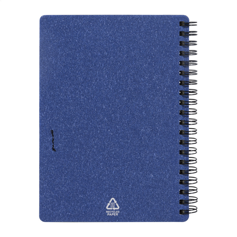 Špirálový blok A6 z recyklovaného papiera s 80 linajkovými listami. Vrátane recyklovaného papiera a guľôčkového pera z recyklovaného PP s modrou náplňou.
