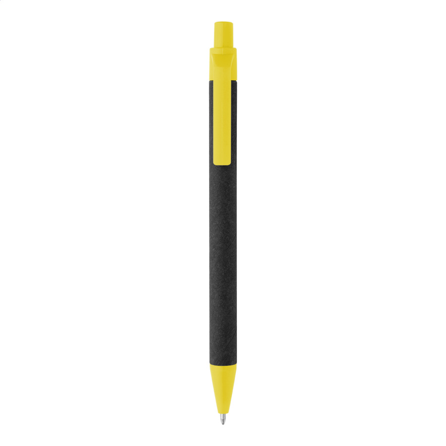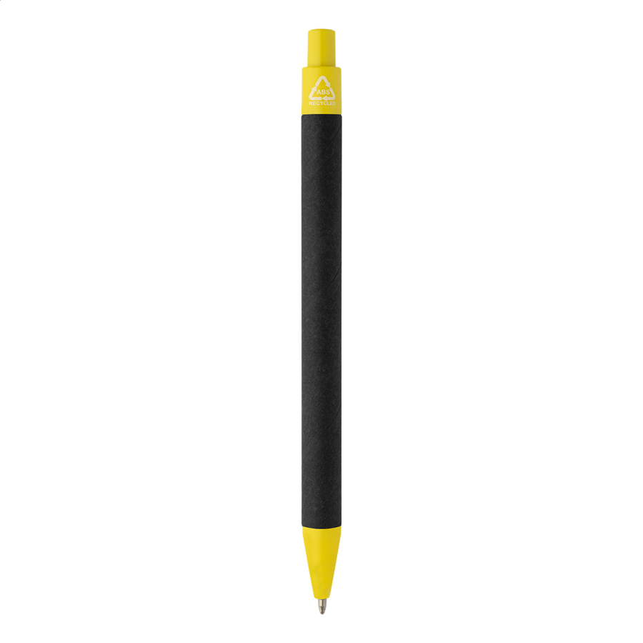 Guľôčkové pero z recyklovaného papiera s čiernym telom a recyklovanými ABS dielmi. S modrou náplňou.