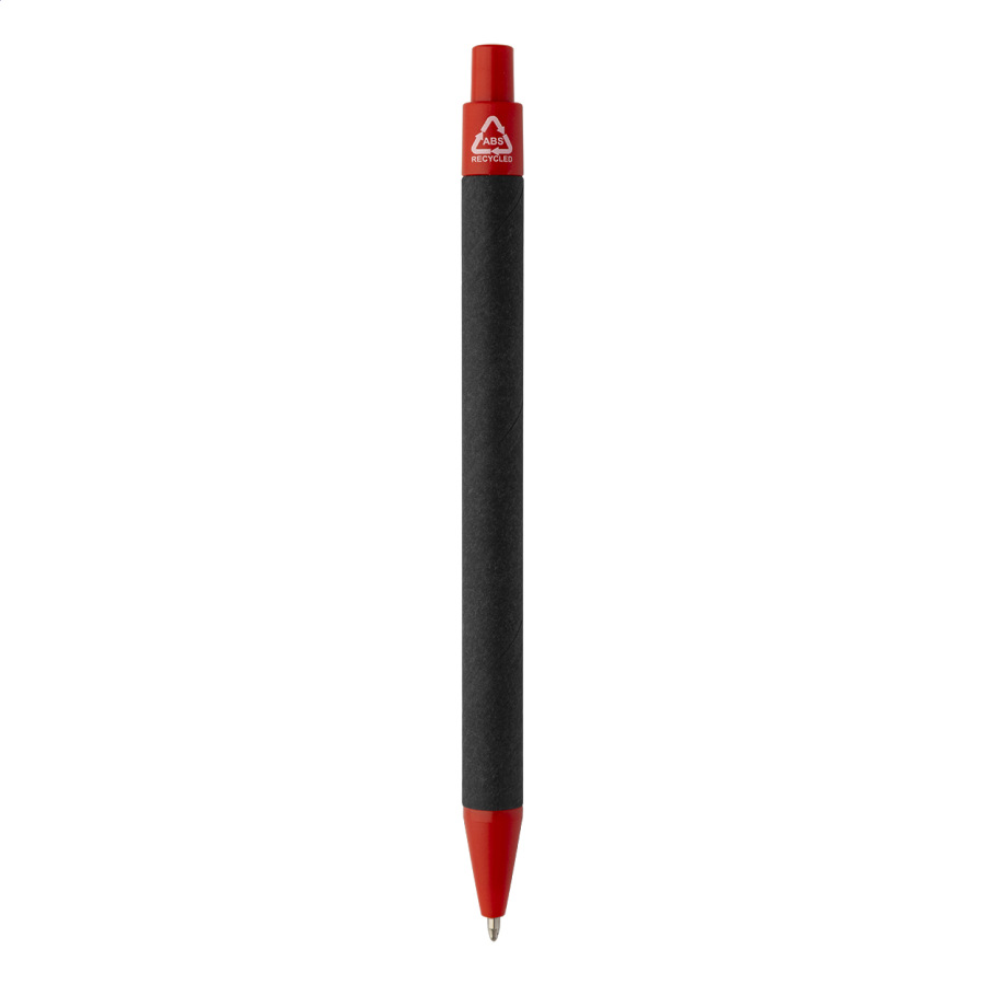 Guľôčkové pero z recyklovaného papiera s čiernym telom a recyklovanými ABS dielmi. S modrou náplňou.