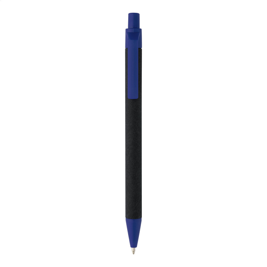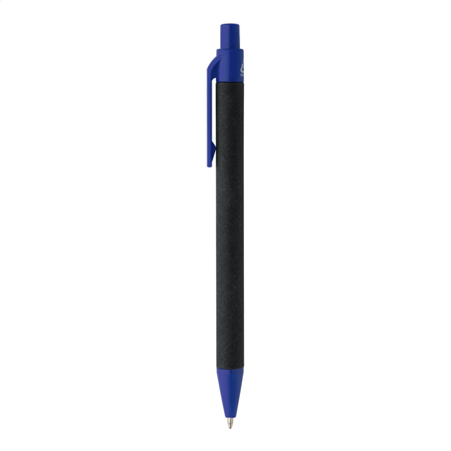 Guľôčkové pero z recyklovaného papiera s čiernym telom a recyklovanými ABS dielmi. S modrou náplňou.