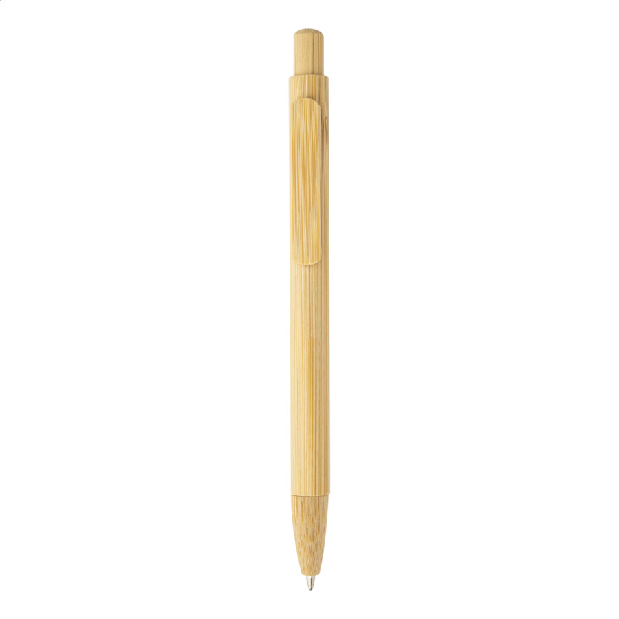 Guľôčkové pero s bambusovým telom, klipom, tlačidlom a hrotom. S modrou náplňou.