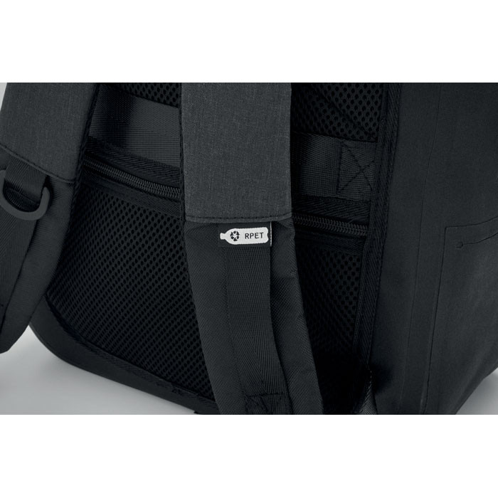 Batoh na 16''notebook z polyesteru 300D RPET s podšívkou z 210D polyesteru. Voděodolná tkanina. Skrytá kapsa na zip a poutko na kufřík na zadní straně. Polstrovaná vnitřní přihrádka na notebook, záda ze síťoviny a ramenní popruh.