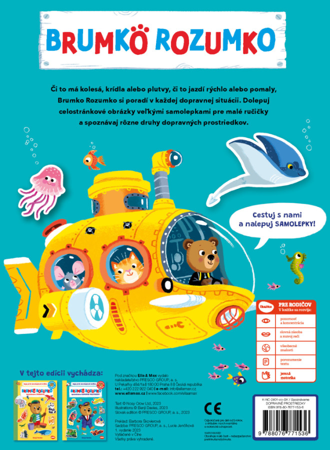 Poďte objavovať svet spolu s Brumkom! Táto knižka veľkých samolepiek pre malé rúčky deti určite očarí. Milý medvedík ich prevedie svetom dopravných prostriedkov a s množstvom z nich ich aj bližšie zoznámi… Či už to má kolesá, krídla alebo plutvy, ide to rýchlo alebo pomaly, Brumko Rozumko sa v strojoch skrátka vyzná! Deti sa s ním vydajú na úžasnú cestu za poznaním a zoznámia sa s rôznymi druhmi dopravných prostriedkov.