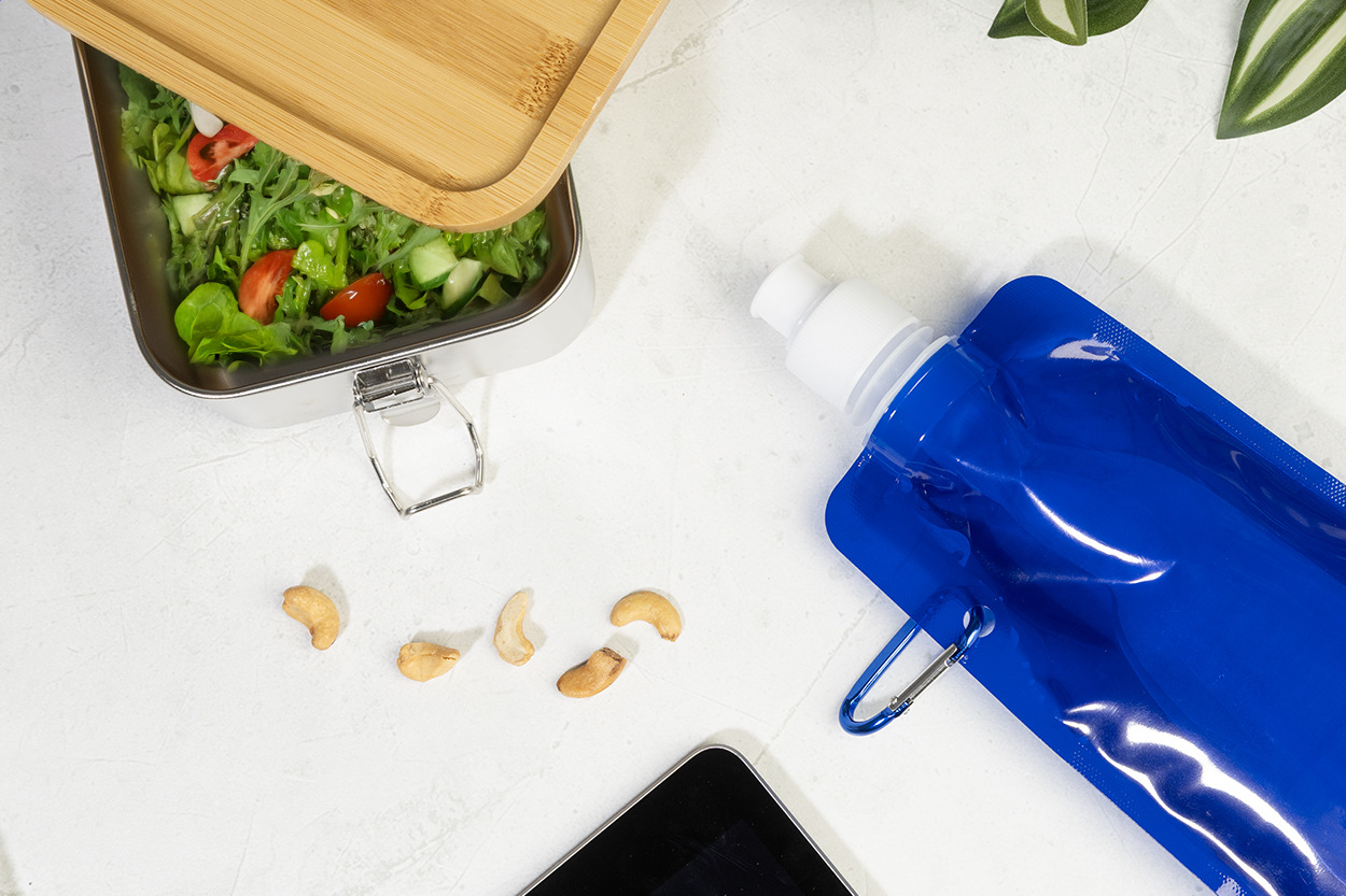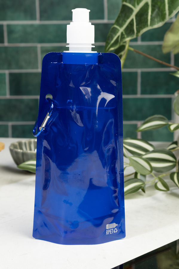 Skladacia športová fľaša z RPET s viečkom na pitie a hliníkovou karabínou, 500 ml. Bez BPA. Nevhodná pre sýtené nápoje.