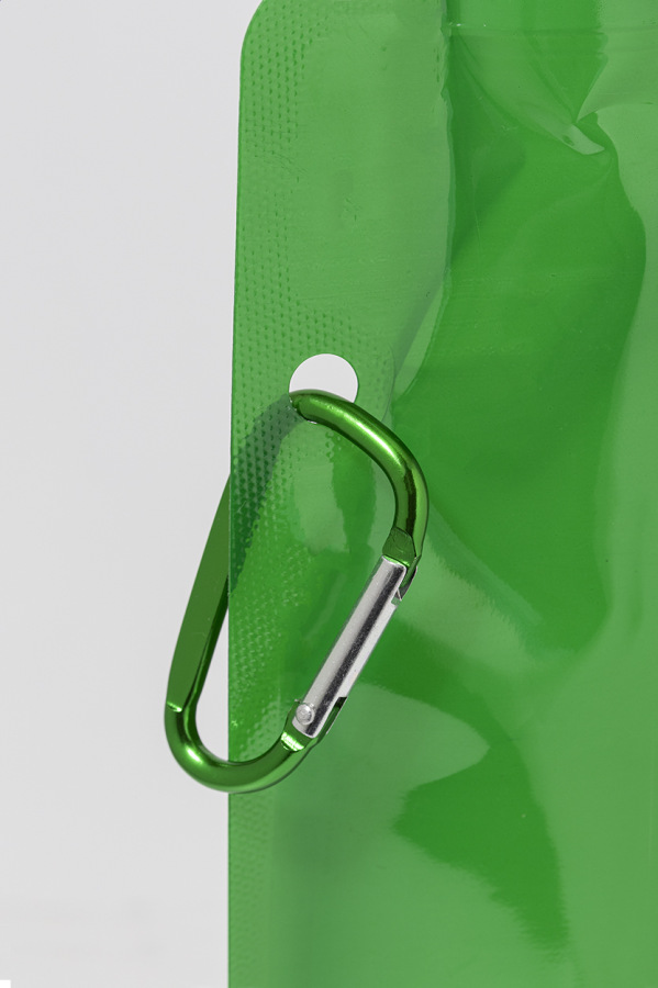 Skladacia športová fľaša z RPET s viečkom na pitie a hliníkovou karabínou, 500 ml. Bez BPA. Nevhodná pre sýtené nápoje.