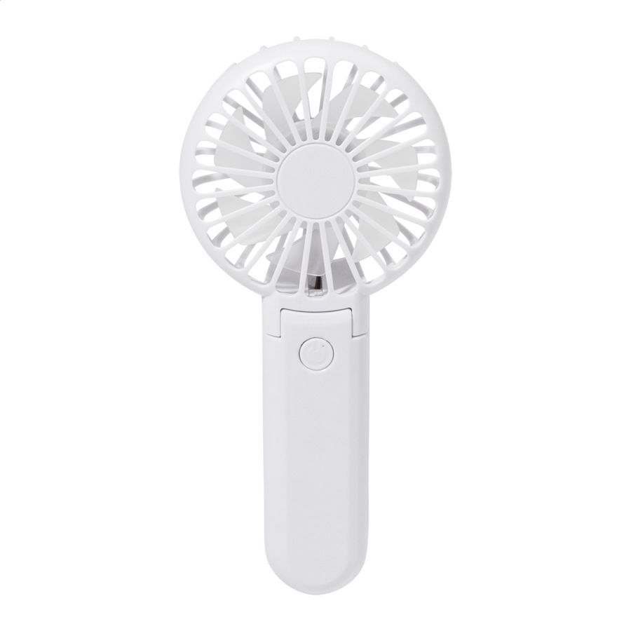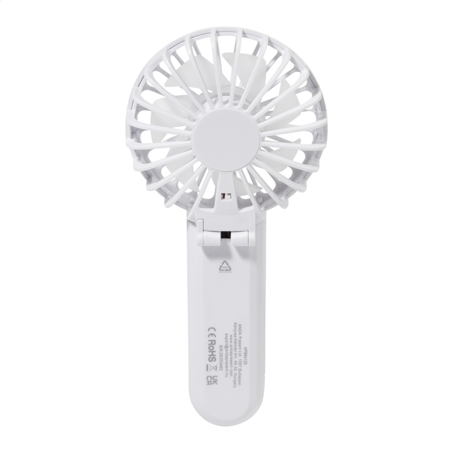 Elektrický ručný vetráčik z recyklovaného ABS plastu so vstavanou dobíjacou batériou cez USB (400 mAh). S nastaviteľným uhlom hlavy a 3 rýchlosťami. Vrátane USB kábla na nabíjanie.
