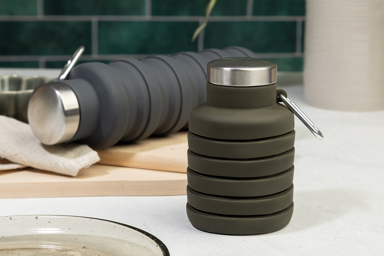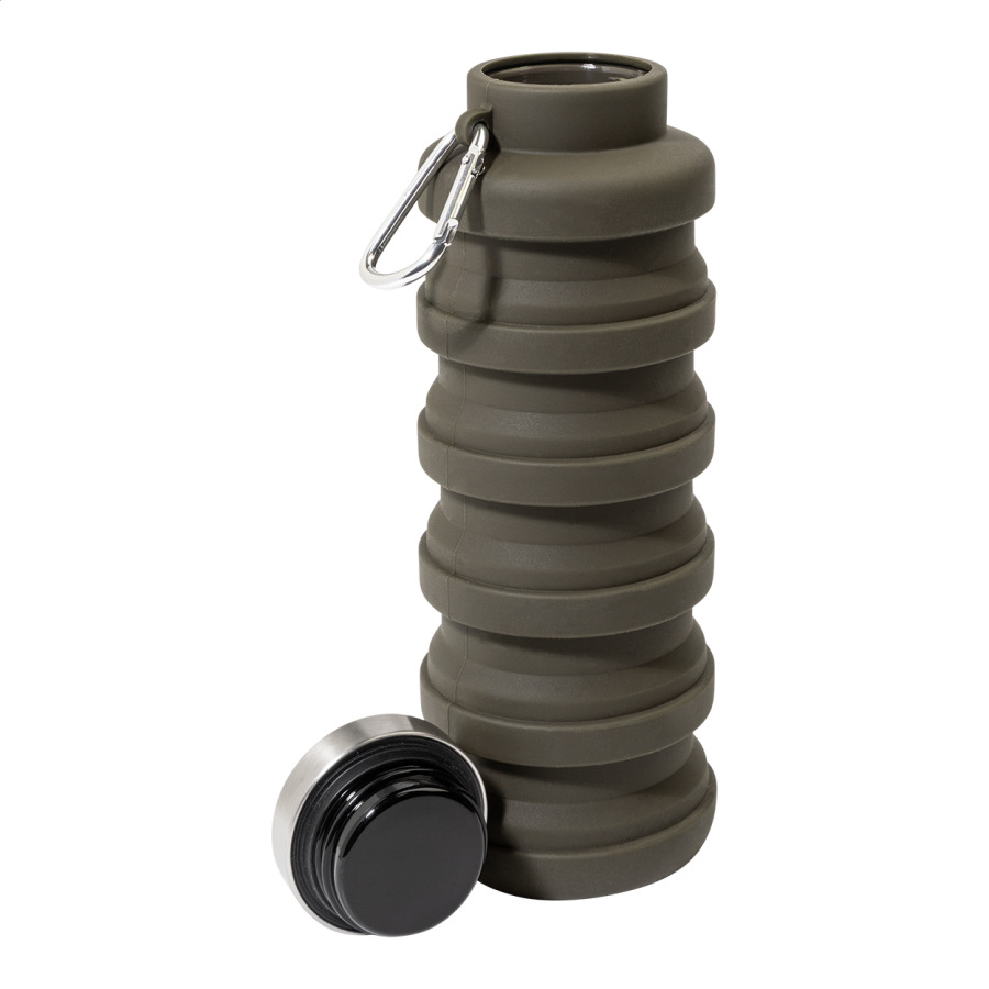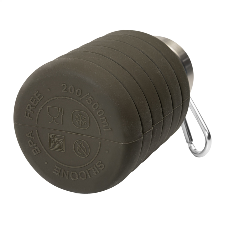Skladacia silikónová fľaša s viečkom z nerezovej ocele a hliníkovou karabínou. 500 ml