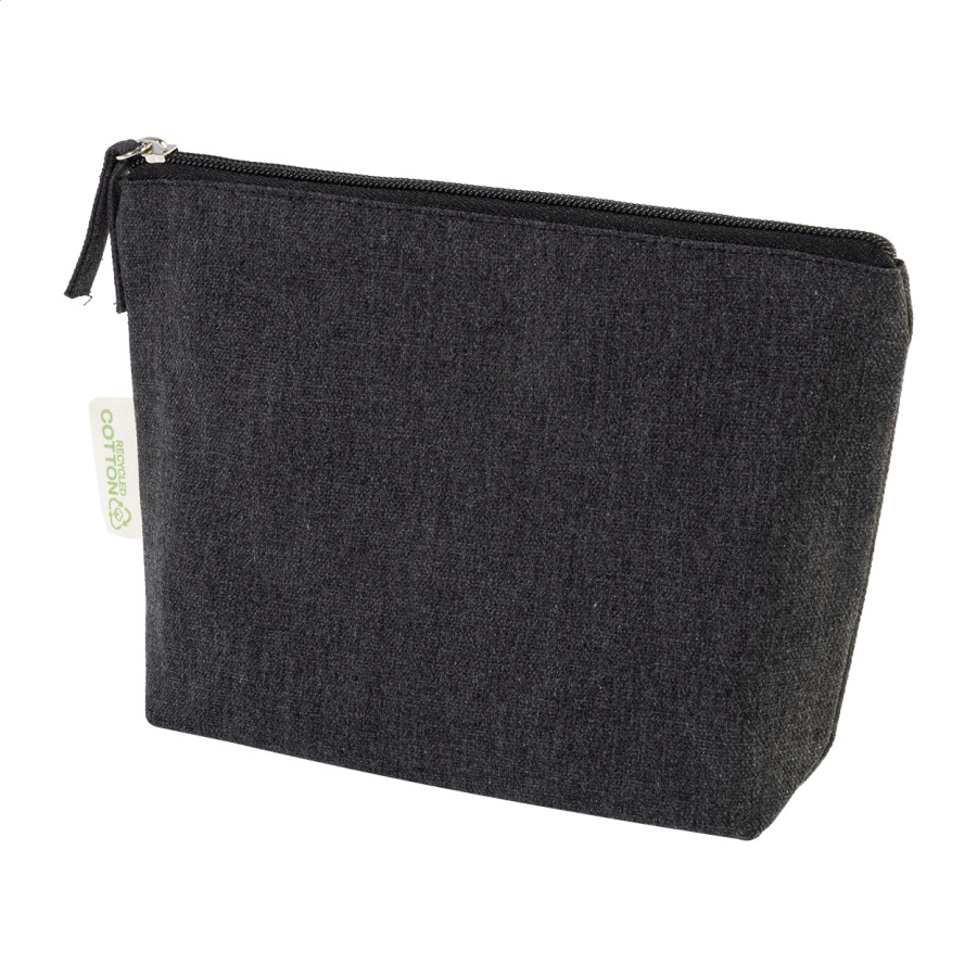 Kozmetická taštička na zips zo 70% recyklovanej bavlny a 30% RPET polyesteru, 280 g/m². S výraznou etiketou o recyklovanej bavlne.