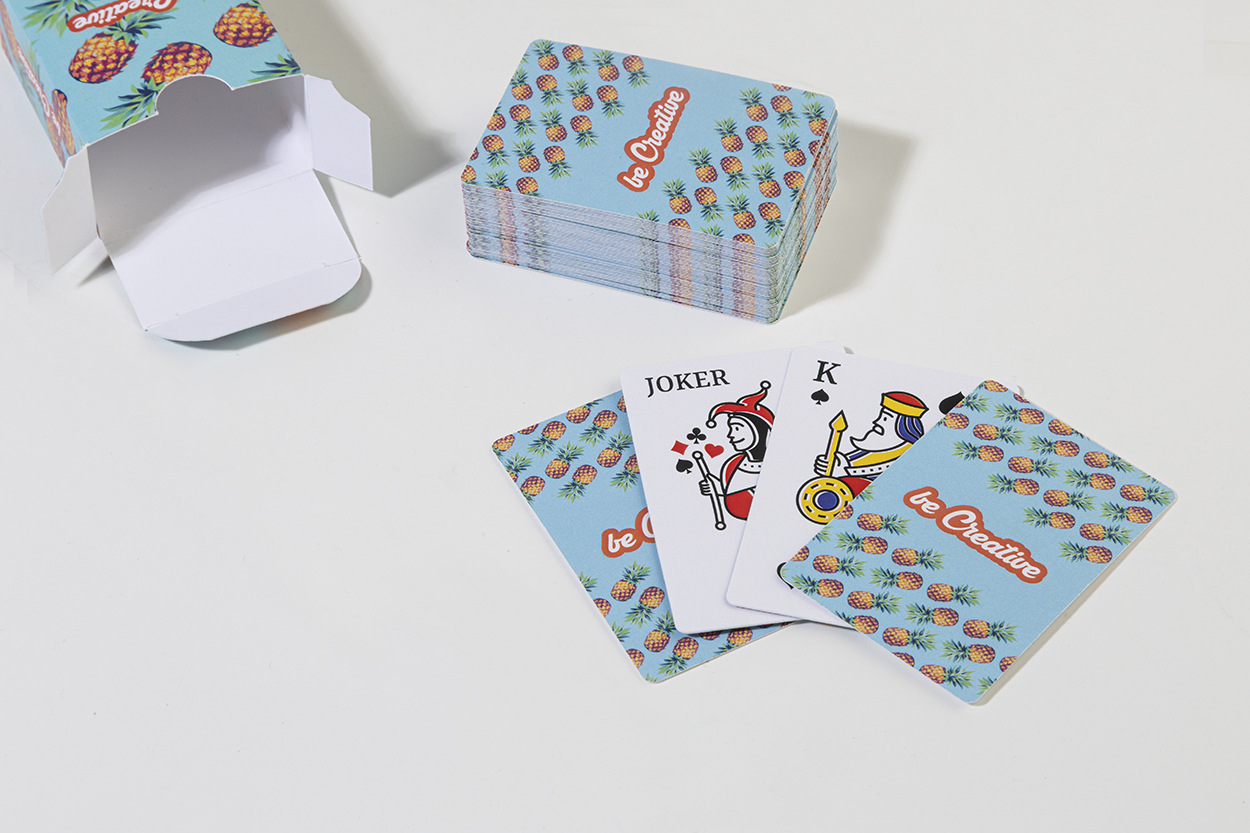 Cestovné miniatúrne klasické hracie karty v papierovej krabičke na zákazku. Jeden štandardný balíček s 54 kartami. Cena zahŕňa farebne potlačenú krabičku a identickú farebnú potlač na zadnej strane každej karty, cena nezahŕňa tlačovú prípravu. Min. mn.: 100 ks.