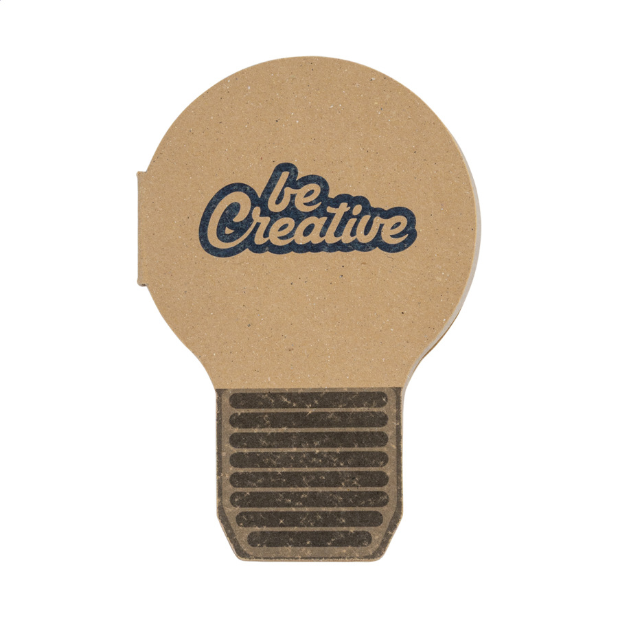Samolepiaci blok v tvare žiarovky na zákazku, potiahnutý recyklovaným kraftovým papierom. Obsahuje 50 listov samolepiacich papierov z recyklovaného papiera. Cena zahŕňa vonkajší obal s plnofarebnou potlačou, nezahŕňa tlačovú prípravu. Min. mn.: 100 ks.