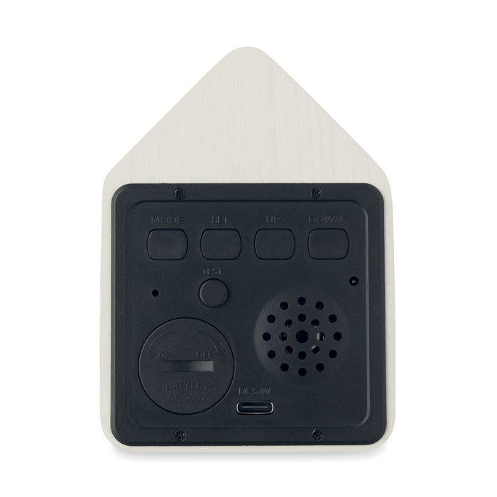 Malé stolní hodiny z MDF s budíkem a hlasem kukačky. Včetně ukazatele teploty. Bílý LED displej . Zvuk se automaticky ztlumí mezi 22:00 a 6:00.
