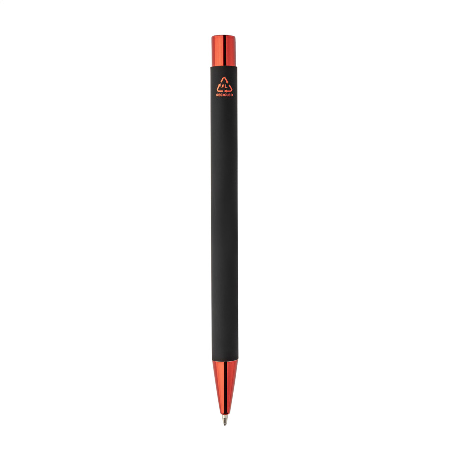 Guľôčkové pero z recyklovaného hliníka s čiernym pogumovaným telom a farebnými lesklými kovovými časťami. So špeciálnym povrchom na zrkadlové gravírovanie, ktoré ladí s kovovými časťami. S modrou náplňou.