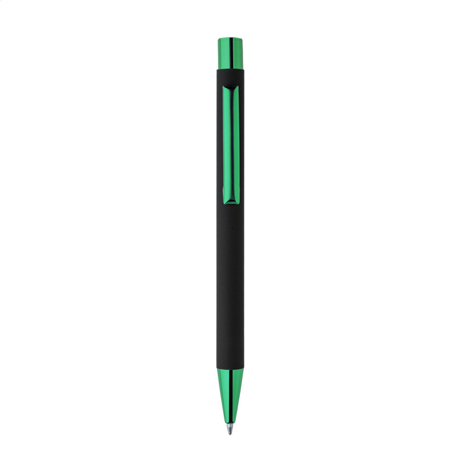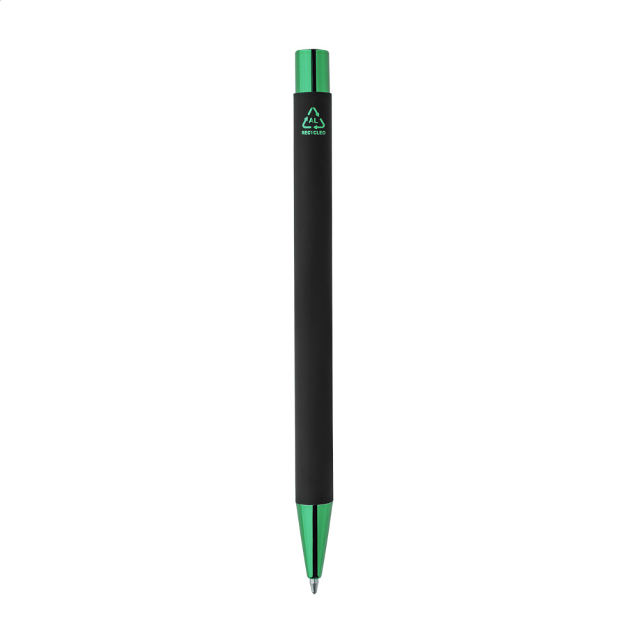 Guľôčkové pero z recyklovaného hliníka s čiernym pogumovaným telom a farebnými lesklými kovovými časťami. So špeciálnym povrchom na zrkadlové gravírovanie, ktoré ladí s kovovými časťami. S modrou náplňou.