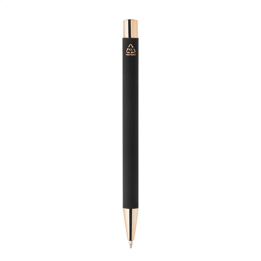Guľôčkové pero z recyklovaného hliníka s čiernym pogumovaným telom a farebnými lesklými kovovými časťami. So špeciálnym povrchom na zrkadlové gravírovanie, ktoré ladí s kovovými časťami. S modrou náplňou.