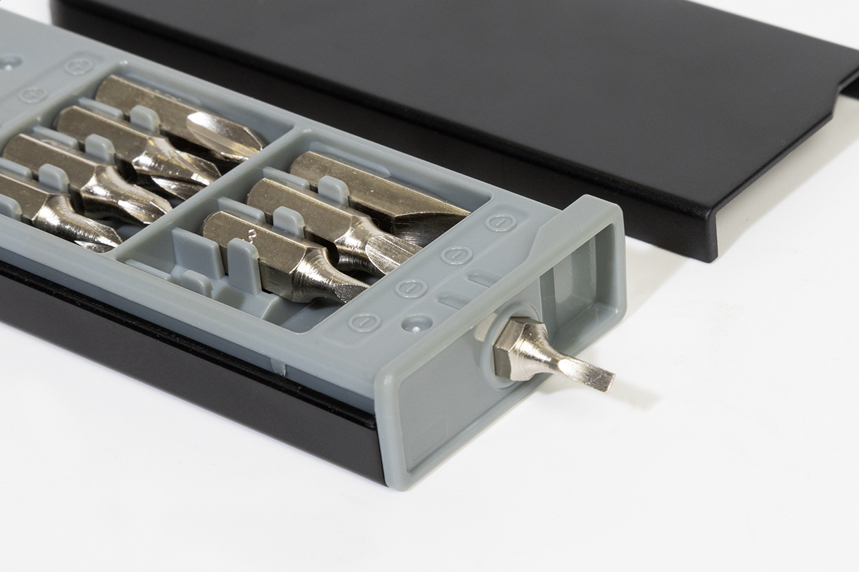 Kompaktná sada náradia v puzdre z recyklovaného ABS materiálu s 8 skrutkovacími bitmi a vstavaným 1m metrom.