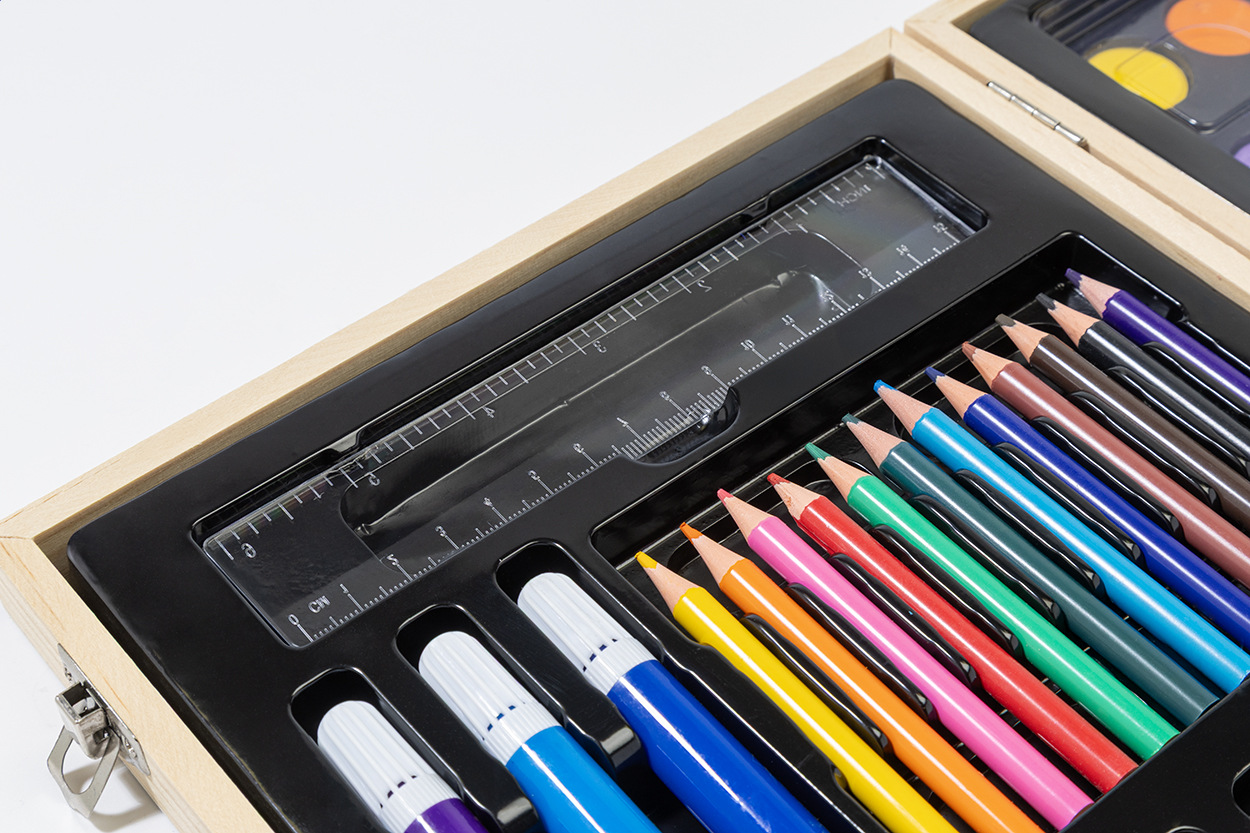 Komplexná 66dielna sada na kreslenie a vyfarbovanie v drevenej prepravnej krabičke. Obsahuje: 12 voskoviek, 12 olejových pastelov, 12 ceruziek, 12 fixiek, 12 akvarelových farieb s paletou a štetcom, pravítko, gumu, strúhadlo a lepidlo.