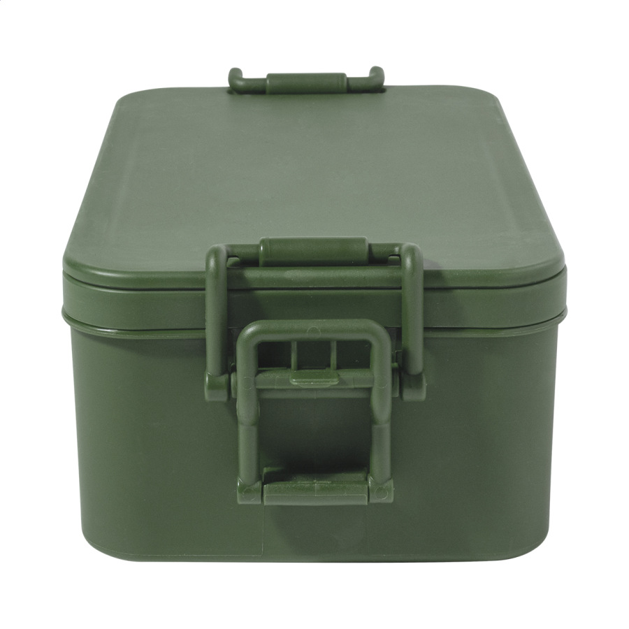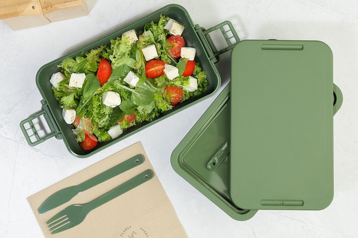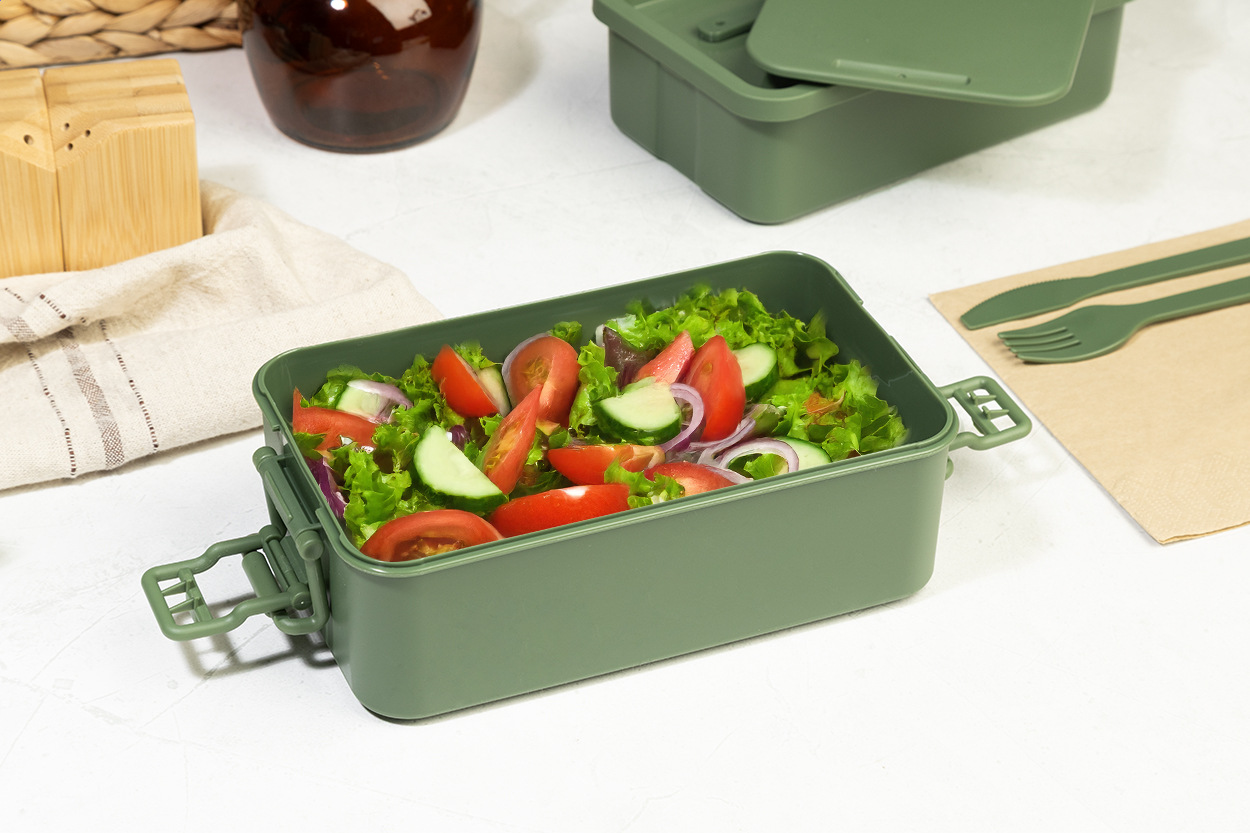 Box na jedlo z PP plastu so sadou príborov (vidlička, lyžica a nôž), zapínaním na pracku a 2 priehradkami (1000 ml a 800 ml). Stohovateľný design pre kompaktné skladovanie.