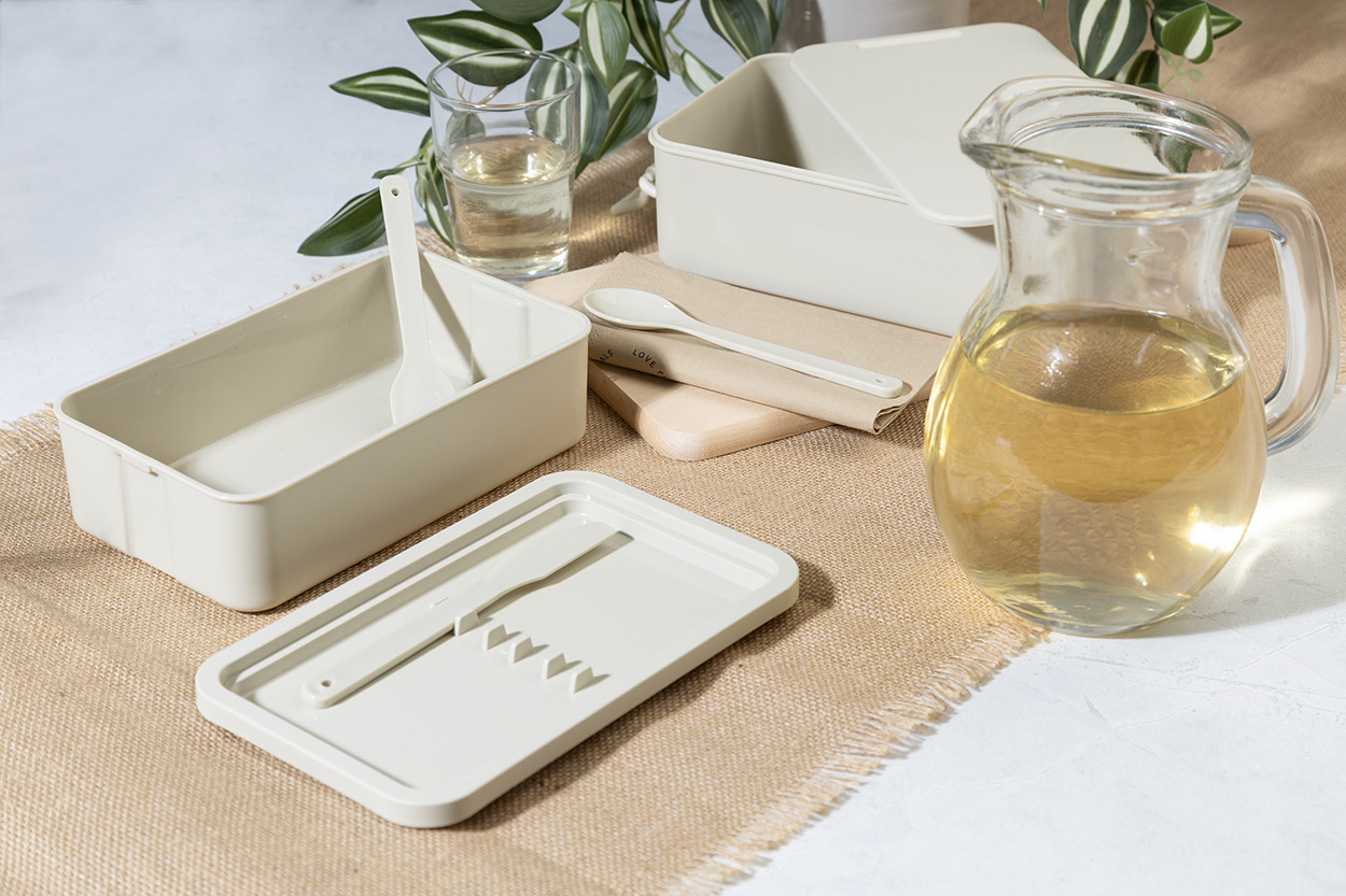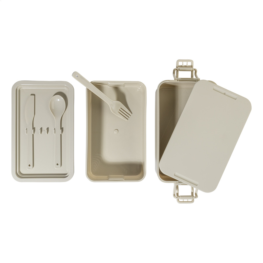 Box na jedlo z PP plastu so sadou príborov (vidlička, lyžica a nôž), zapínaním na pracku a 2 priehradkami (1000 ml a 800 ml). Stohovateľný design pre kompaktné skladovanie.
