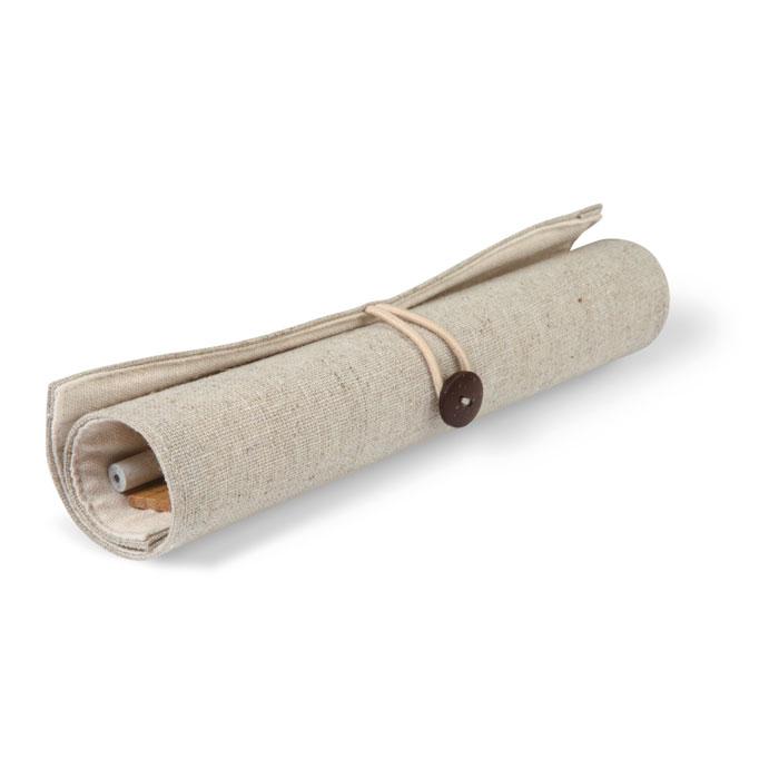 Sada kancelářských potřeb v pouzdře z juty a bavlny obsahuje bambusové pravítko, tužku s papírovým tělem, kartonové kuličkové pero s modrou náplní, dřevěné ořezávátko a gumu. Bambus je přírodní materiál, může dojít k mírným změnám barvy, dekorace a velikosti.