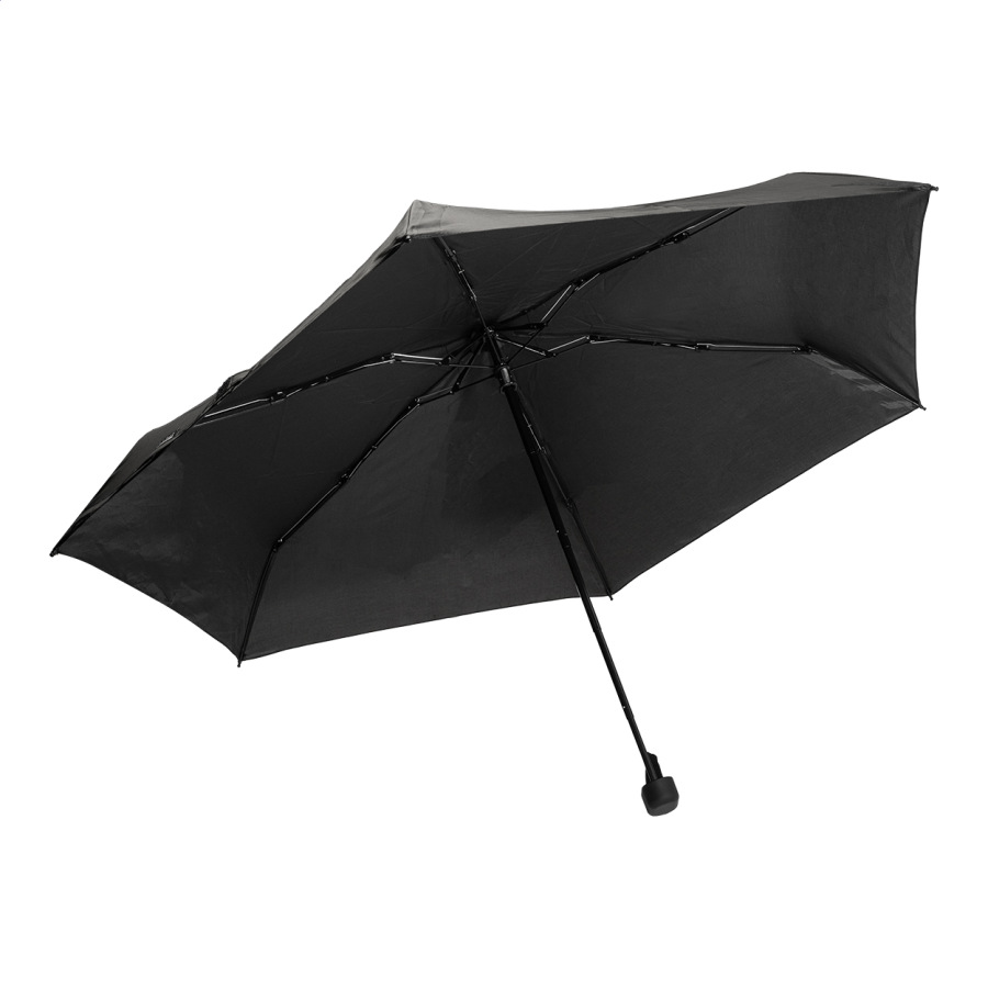 Manuálny, vetruodolný 3-skladací mini dáždnik so 6 panelmi vo farebne zladenom puzdre a tvrdým puzdrom z EVA na zips. S kovovým rámom, rebrami zo sklolaminátu a kompaktnou rukoväťou s pútkom na ruku. 190T RPET pongee s charakteristickým RPET štítkom.
