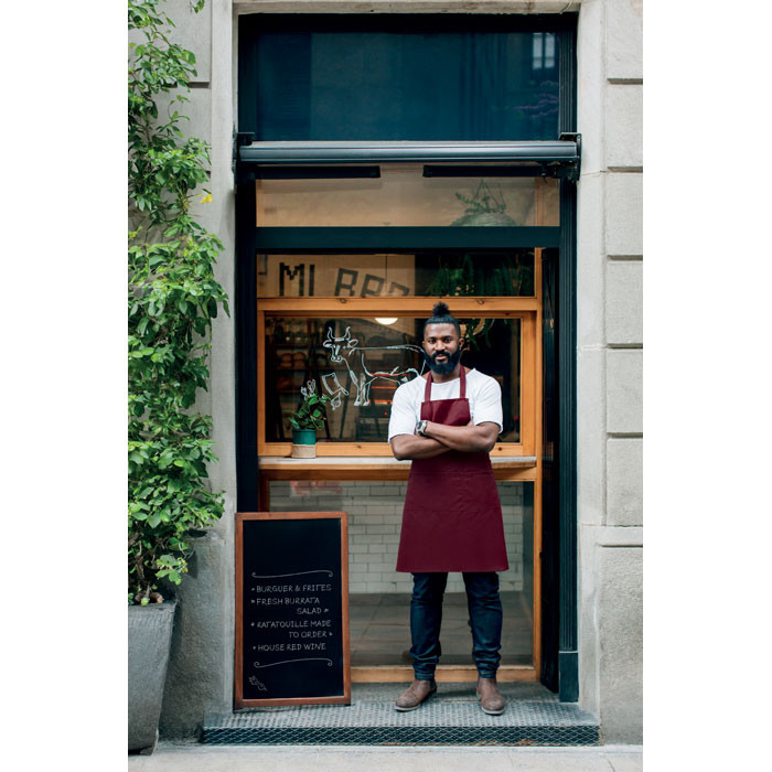 Nastavitelná zástěra s laclem a 1 velkou přední kapsou a 2 přihrádkami. Organická bavlna o gramáži 240 g/m². S nastavitelným popruhem pomocí knoflíku.