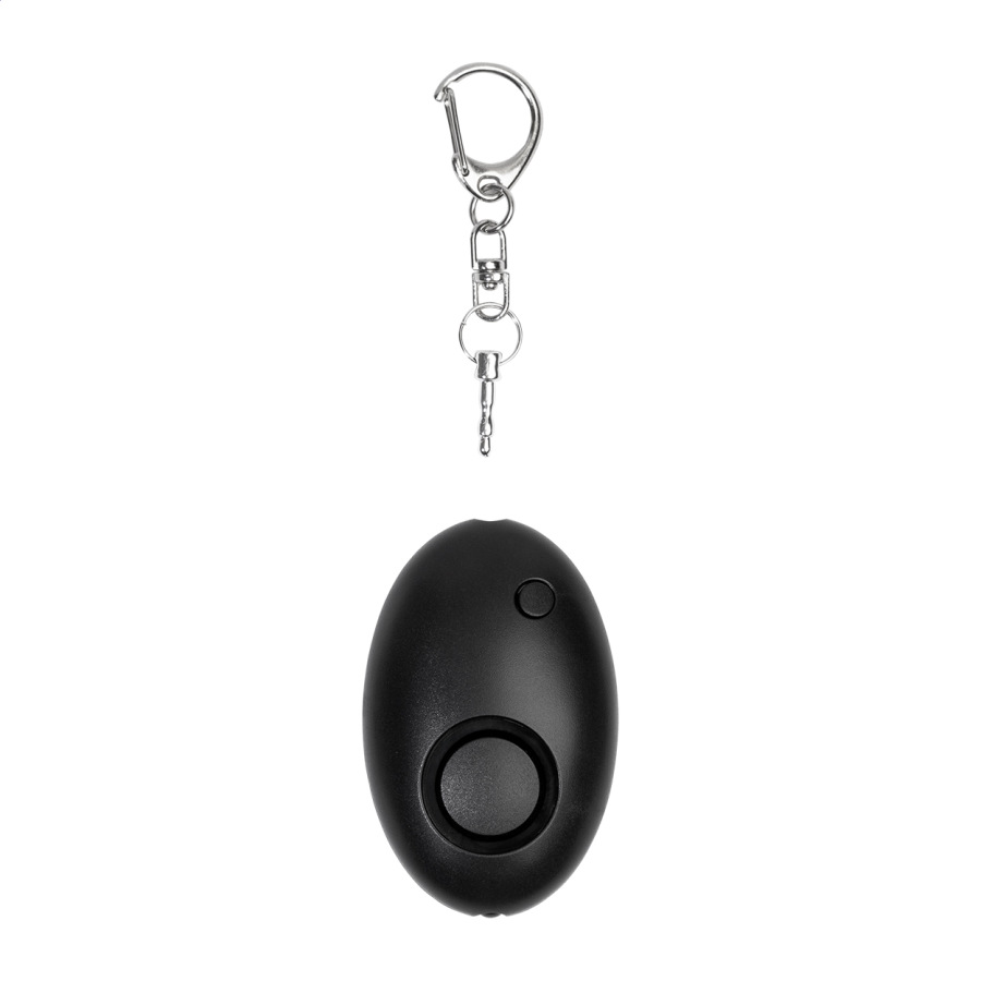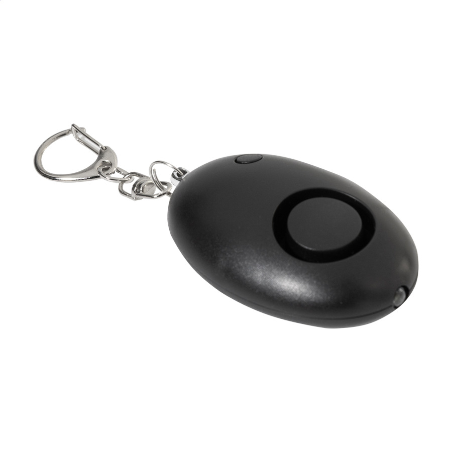 Osobný alarm z recyklovaného ABS materiálu s kovovou karabínou na kľúče a 1 LED svietidlom. Alarm sa aktivuje po zatiahnutí za kolík. Hlasitosť alarmu: cca 100 dB. S gombíkovými batériami.