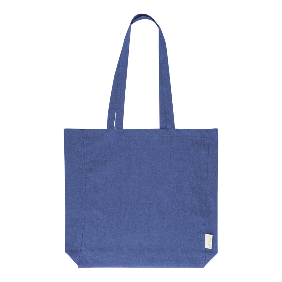 Nákupná taška s klinom a dlhými ušami zo 70% recyklovanej bavlny a 30% RPET polyesteru, 140 g/m². S výraznou etiketou o recyklovanej bavlne.