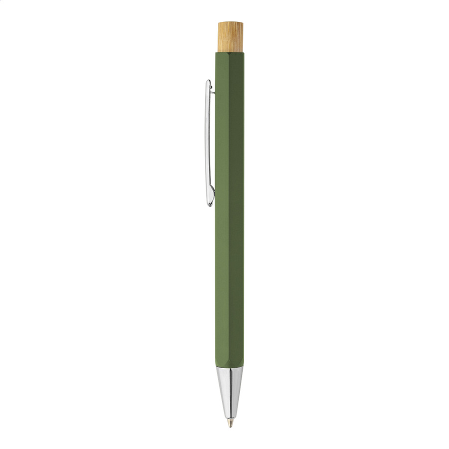 Šesťhranné guličkové pero z recyklovaného hliníka s bambusovým tlačidlom a chrómovanými časťami. S modrou náplňou.