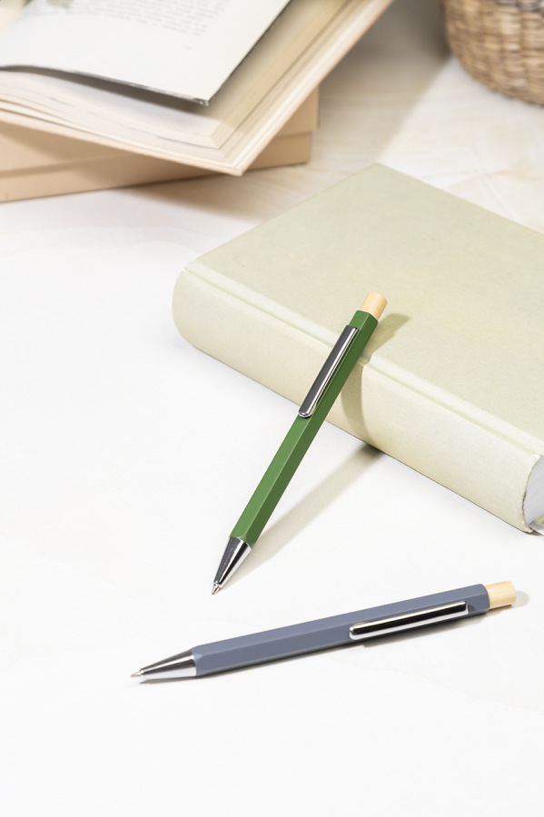 Šesťhranné guličkové pero z recyklovaného hliníka s bambusovým tlačidlom a chrómovanými časťami. S modrou náplňou.