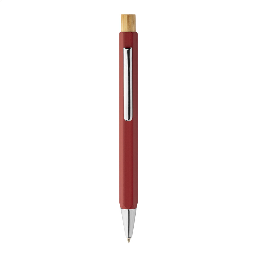 Šesťhranné guličkové pero z recyklovaného hliníka s bambusovým tlačidlom a chrómovanými časťami. S modrou náplňou.