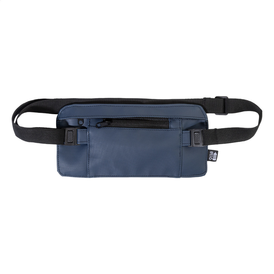 Úzka ľadvinka z RPET s prednou stranou potiahnutou PU, priehradkou na zips a predným vreckom a nastaviteľným popruhom. Polyester 600D RPET s PU záterom a výrazným štítkom RPET.