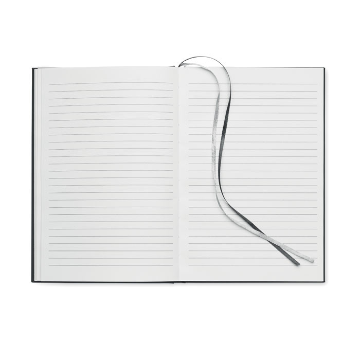 Zápisník A5 z 60% recyklovaného polyesteru a 40% PU. 256 linkovaných stran (128 listů) z recyklovaného 70g papíru. Dvě záložky z polyesterové stuhy.