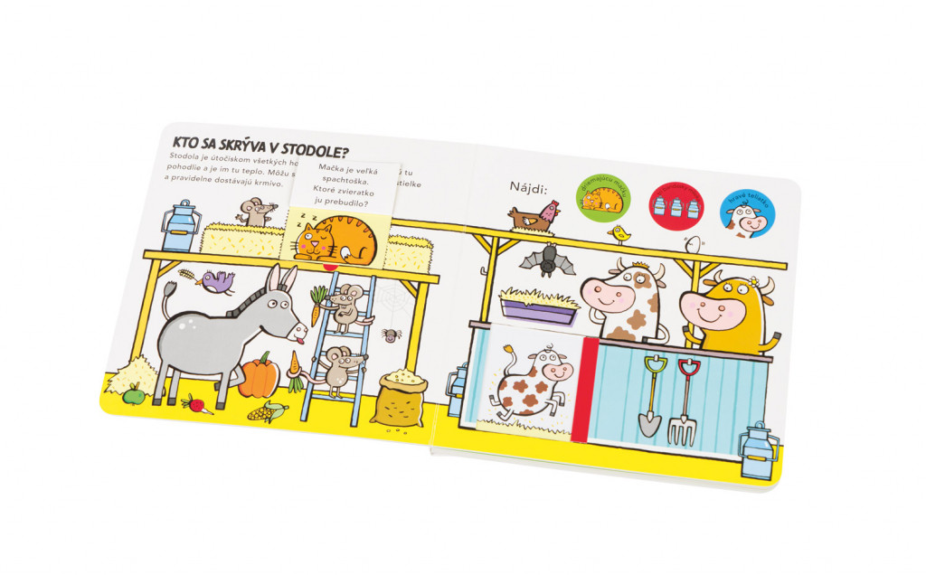 Obľúbený formát leporela s odklápacími chlopňami a posuvnými dvierkami poskytuje malým čitateľom dôvtipnú zábavu a zároveň formuje ich predstavu o tom, ako to vyzerá na hospodárskom dvore a čo všetko sa tam môže diať. Práca s takouto knihou prispieva zároveň k zlepšovaniu koordinácie ruka – oko. Deti tu objavujú zvieratká ukryté v stodole, na pastvine, na dvore, na záhradke, či na poli a riešia jednoduché úlohy zamerané na rozvoj pozornosti a základných matematických predstáv.