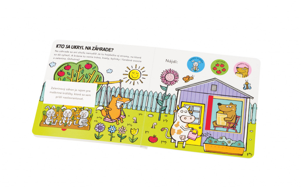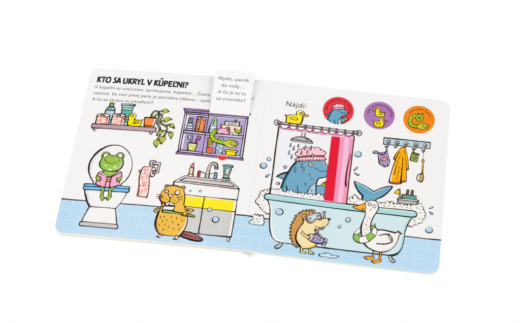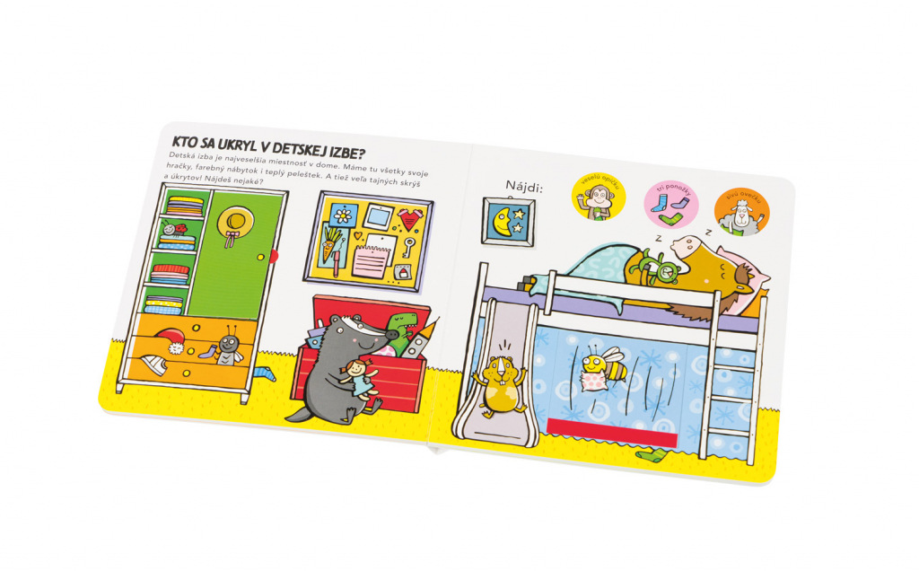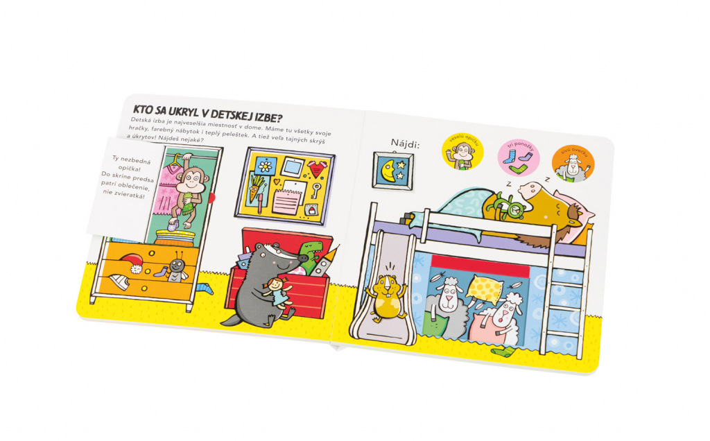 Obľúbený formát leporela s odklápacími chlopňami a posuvnými dvierkami poskytuje malým čitateľom dôvtipnú zábavu a zároveň formuje ich predstavu o tom, ako to vyzerá v jednotlivých miestnostiach v dome a na čo tieto miestnosti zvyčajne slúžia. Práca s takouto knihou prispieva aj k zlepšovaniu koordinácie ruka – oko. Deti tu objavujú zvieratká ukryté v kuchyni, v obývačke, v detskej izbe, v kúpeľni, či na záhradke a riešia jednoduché úlohy zamerané na rozvoj pozornosti a základných matematických predstáv.