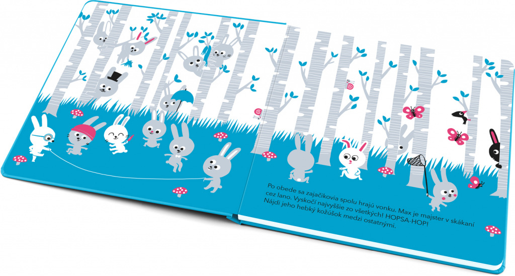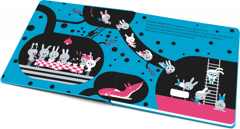 Toto výnimočné leporelo plné milých ušiačikov zaujme nielen jednoduchou modernou ilustráciou a výraznými farbami, ale aj tým, že neslúži len na čítanie a prehliadanie ako väčšina ostatných. Hlavný hrdina, králik Max, ktorého deti nájdu na každej dvojstrane, má totiž nádherne zamatový kožúšok. Odhaliť ho medzi množstvom ďalších králikov voľným okom je veľmi ťažké, ale stačí pohladiť stránky knihy rukou a Maxa ľahko nahmatáte. Výborná zábava pre všestranný zmyslový rozvoj dieťaťa!