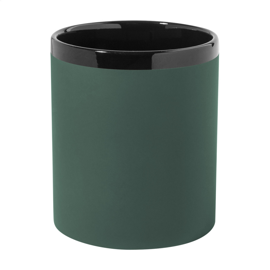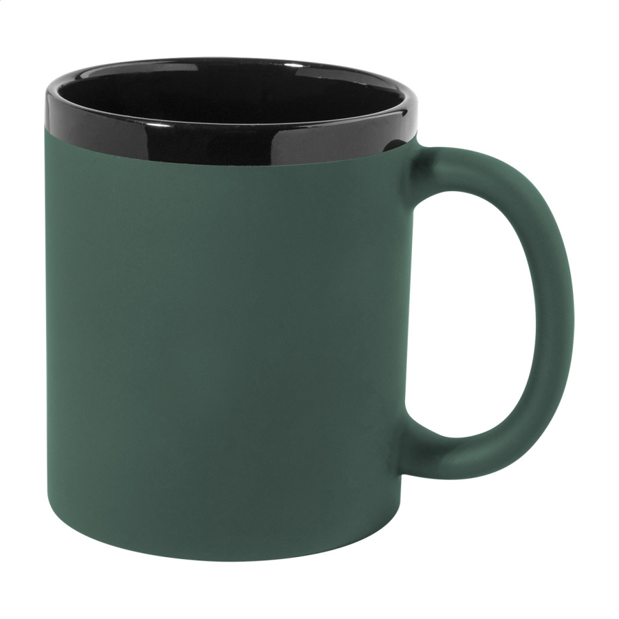 Keramický hrnček s mäkkým pogumovaným povrchom a čiernym vnútrom a okrajom, 300 ml. So špeciálnym povrchom na gravírovanie, gravírované logo ladí s farbou na vnútornej strane. V krabičke z kraftového papiera.