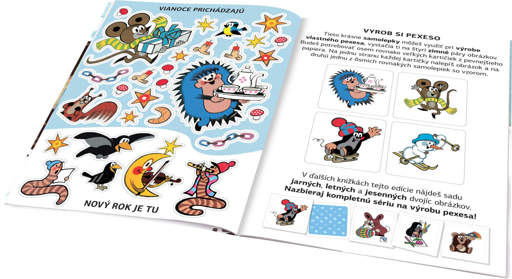 Dvojstránkové scenérie môžu deti dolepovať množstvom pôvabných samolepiek, či už podľa zadania, alebo podľa vlastnej fantázie. V knižke sa okrem toho dozvedia veľa nového a zaujímavého o zime a pomocou samolepiek si môžu vyzdobiť vlastný obrázok, izbičku alebo vyrobiť pexeso!