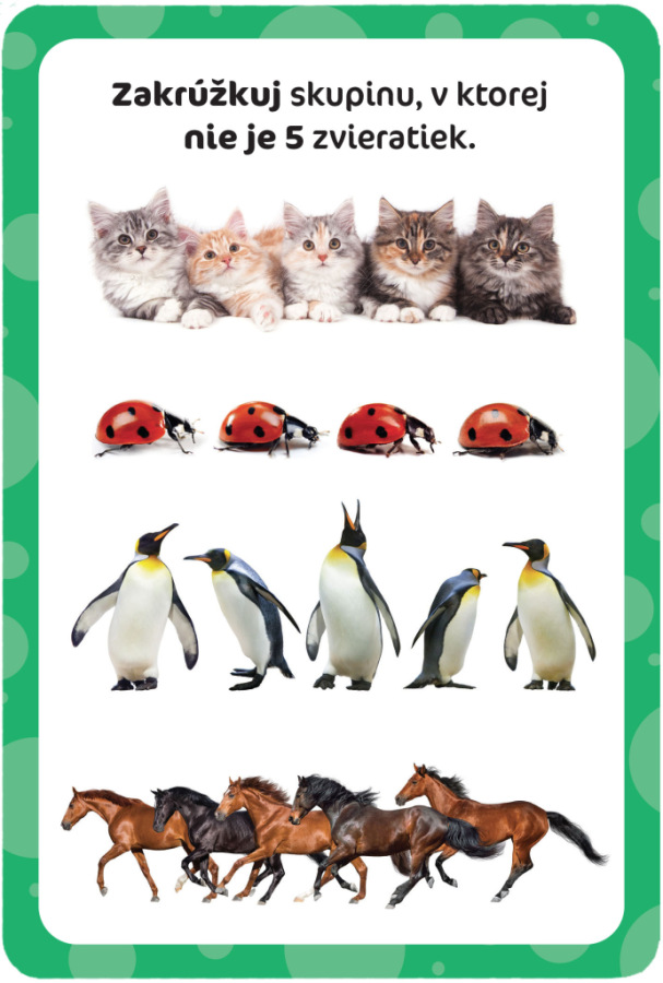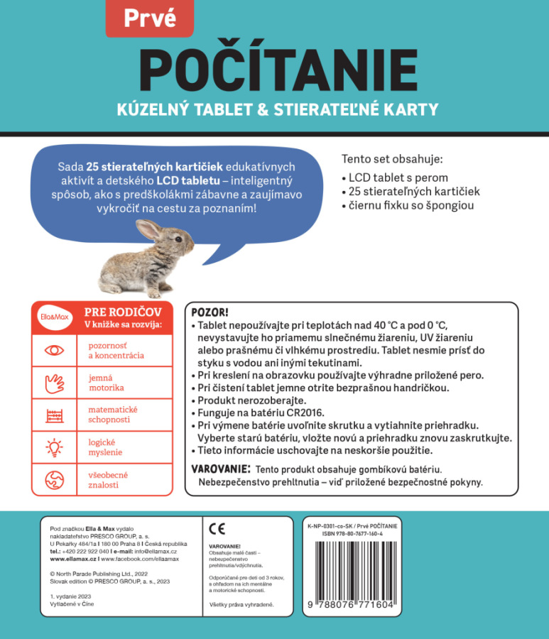 Sada 25 stierateľných kartičiek obsahujúcich 50 edukatívnych aktivít, priložená fixka so špongiou a kúzelný tablet – to je pre rodičov ten najrafinovanejší a pre deti ten najzábavnejší spôsob, ako spoločne vykročiť na cestu za poznávaním čísel a prvých počtov! Práca s výučbovými kartičkami a tabletom rozvíja pozornosť a koncentráciu, jemnú motoriku, matematické schopnosti, logické myslenie a v neposlednom rade všeobecné znalosti!