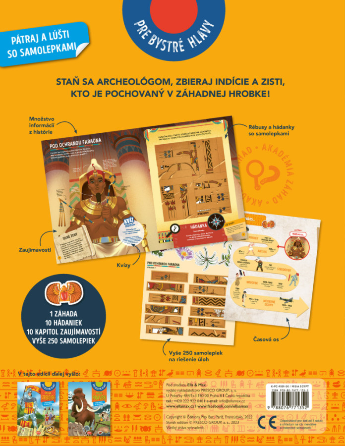 Vydajte sa na dobrodružnú misiu s krycím názvom EGYPT! Akadémia záhad, ktorá rieši hádanky staré stovky, tisíce, ba milióny rokov, má pre vás poriadnu výzvu. Tamojší vedci objavili papyrus, na ktorom je zaznamenané miesto, kde sa má nachádzať hrobka. Tvrdí sa o nej, že je prekliata… Pokračujte v archeologickom pátraní, zbierajte indície, nájdite záhadnú hrobku a zistite, kto je v nej pochovaný. Prídete na to, len ak sa úspešne popasujete so všetkými rébusmi, kvízmi a úlohami! Pri riešení zadaní sa dozviete mnoho pútavých informácií a zaujímavostí z histórie. Pomôžu vám aj samolepky, ktorých tu nájdete vyše 150!