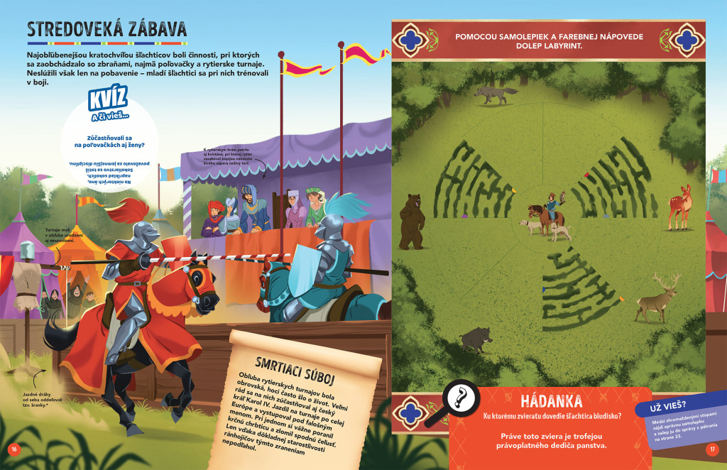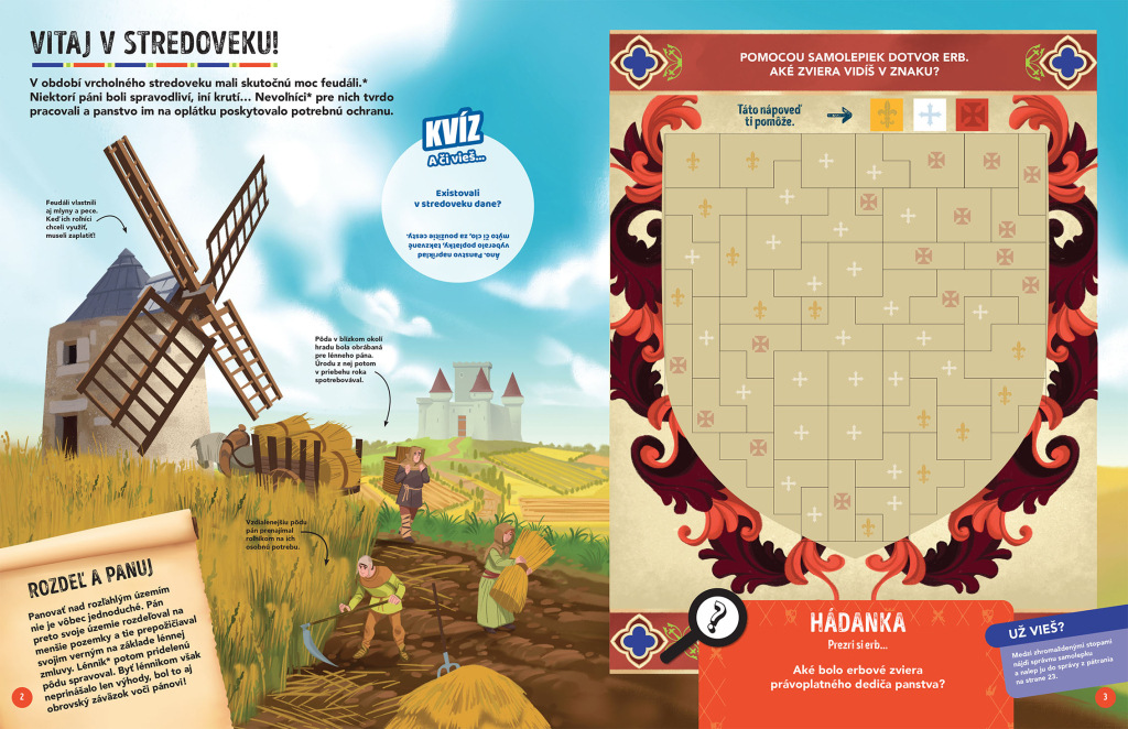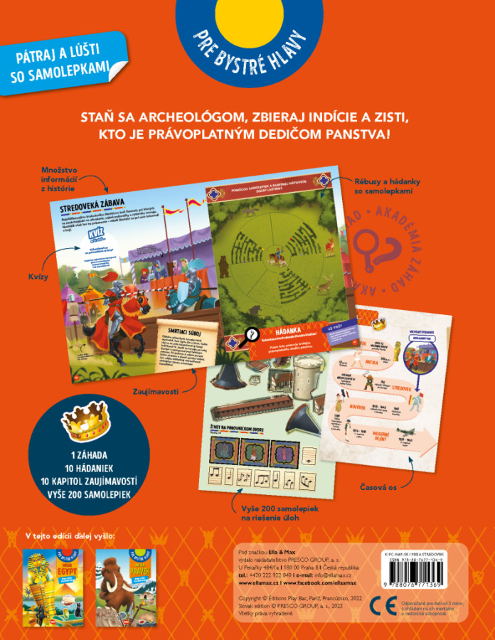 Vydajte sa na dobrodružnú misiu s krycím názvom STREDOVEK! Akadémia záhad, ktorá rieši hádanky staré stovky, tisíce, ba milióny rokov, má pre vás poriadnu výzvu. Šesť šľachticov sa nemôže dohodnúť, komu patrí hradné panstvo, ktorého majiteľom bol kedysi ich predok. Vypravte sa na stredoveký hrad, zistite viac o tunajších šľachticoch a určite, kto má podľa práva získať hrad. Len ak sa úspešne popasujete so všetkými rébusmi, kvízmi a úlohami, dokážete zabrániť vojne o dedičstvo! Pri riešení zadaní sa dozviete mnoho pútavých informácií a zaujímavostí z histórie. Pomôžu vám aj samolepky, ktorých tu nájdete vyše 150!