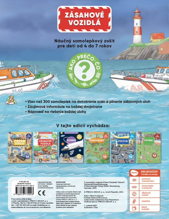 Ako? Prečo? Čo? V tomto náučnom samolepkovom zošite pre deti od 4 do 7 rokov nájdete odpovede na všetky zvedavé otázky týkajúce sa zásahových vozidiel. Na každej dvojstrane sa dočítate veľa zaujímavostí a navyše máte k dispozícii viac ako 300 samolepiek na dotváranie scén a plnenie zábavných úloh! Tie najspletitejšie vám dajú možno trochu zabrať, ale žiadny strach – na konci knižky nechýba malá nápoveď…