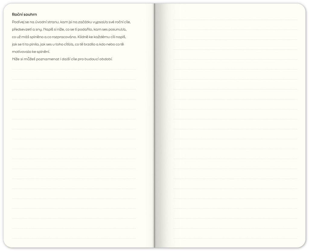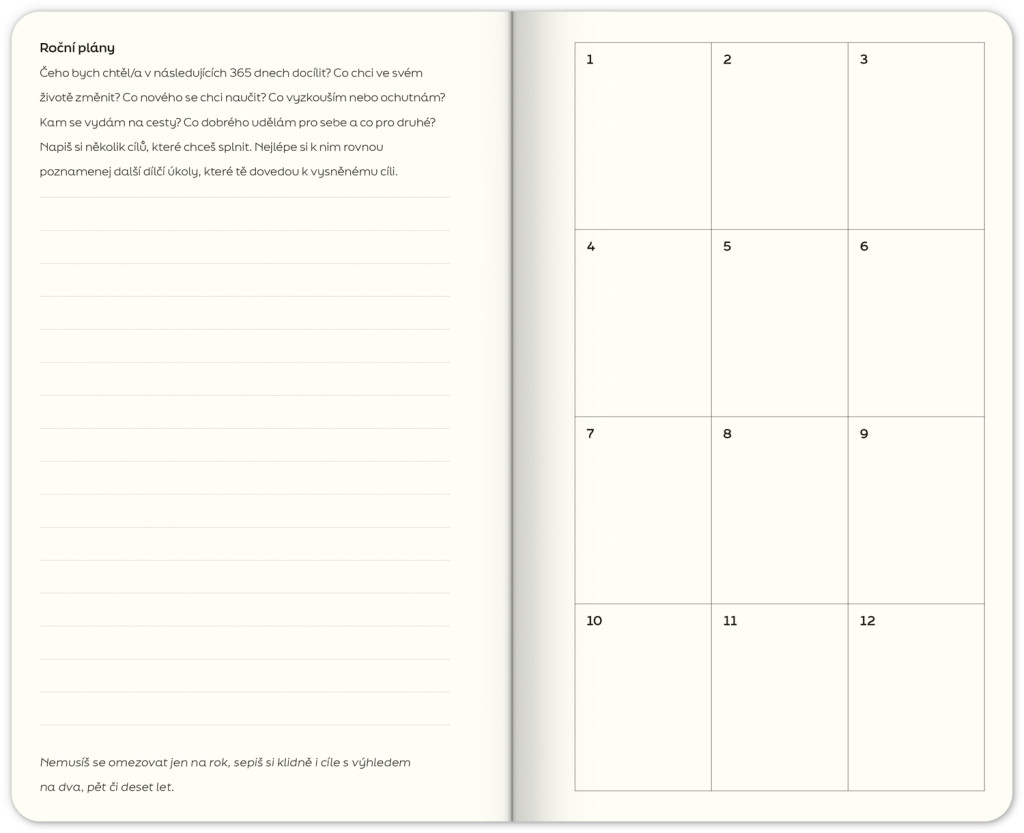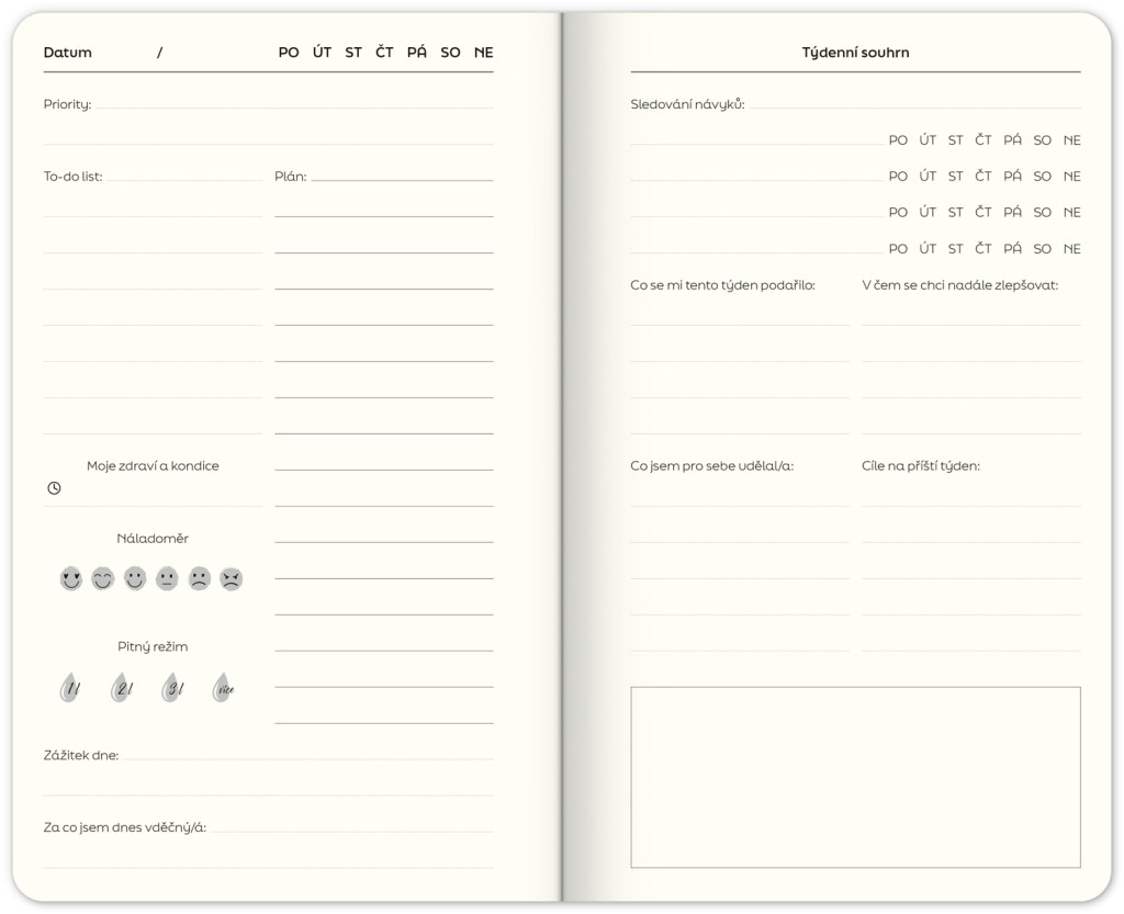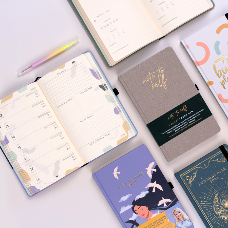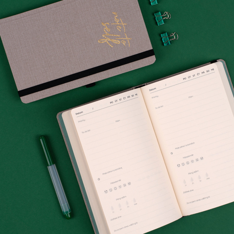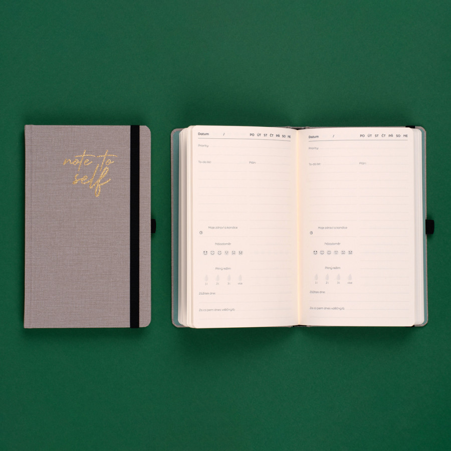 Posuňte svoje plánovanie ešte o úroveň vyššie s diárom Note to self. Ak nad denníkom strávite 5 minút denne, napr. pri pití rannej kávy, budete šťastnejší, uvoľnenejší a výkonnejší. Spomalte a zamyslite sa nad organizáciou vašich aktivít. K tomu vám pomôže týždenné rozvrhnutie a miesto pre sledovanie návykov, sebereflexie a pokroky v osobných cieľoch. S nedatovaným diárom môžete začať kedykoľvek chcete.