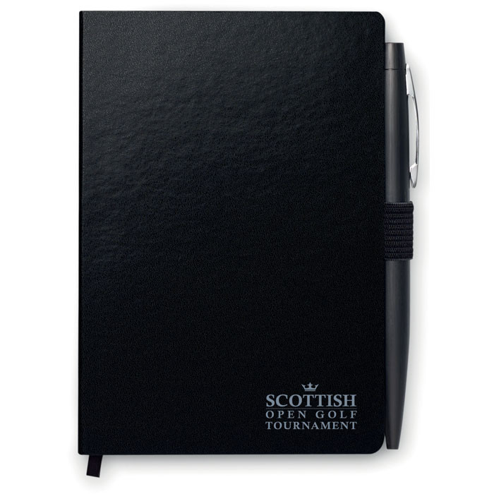 A5 zápisník v tvrdých PU deskách. 72 listů (144 stran), linkovaný papír, gumička a držák propisky. Včetně kovového kuličkového pera s modrým inkoustem. FSC MIX CREDIT | P7.1 | FSC-C213206