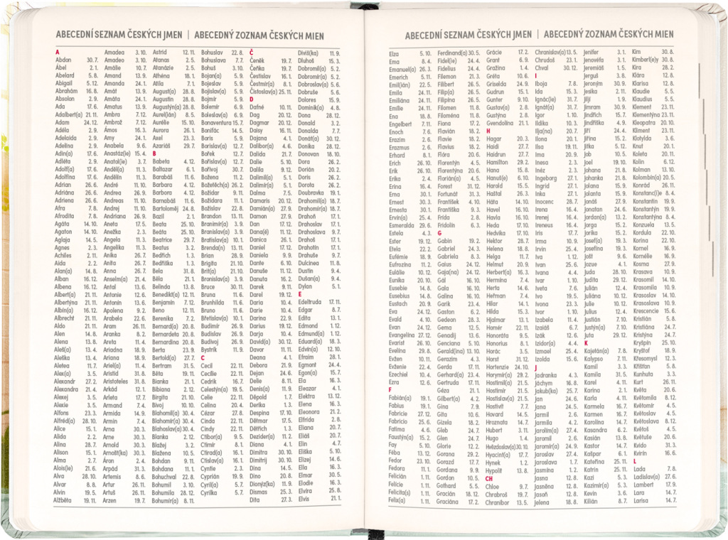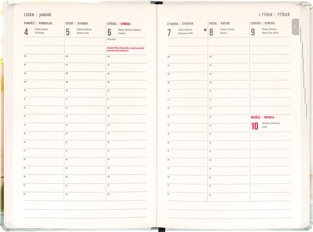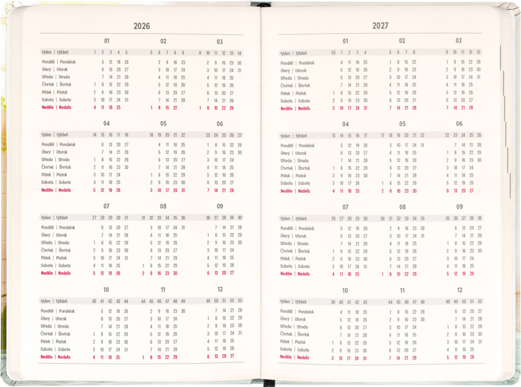 Osemnásťmesačný diár obsahuje prehľad na roky 2026 a 2027, zoznam českých a slovenských mien a česko-slovenský týždenný stĺpcový kalendár s menami a sviatkami. Kalendár začína v júli 2026 a končí v decembri 2027.